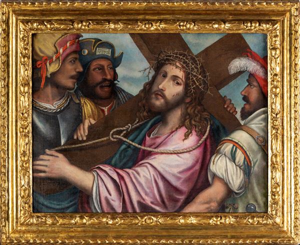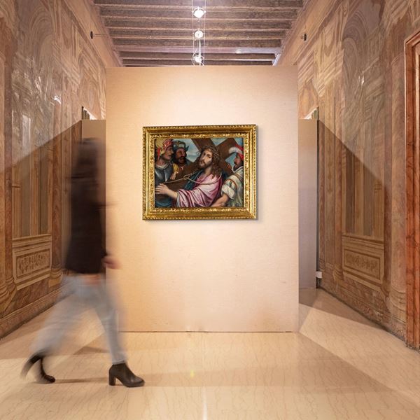 Registrata nella Fototeca Zeri con scheda n. 39114, l’opera, già in collezione Sterbini, raffigura Cristo nell’atto di portare la croce, in composizione rappresentativa del repertorio veneto di Nicolò Frangipane (1555‑1600). Artista attivo tra Venezia e Udine, Frangipane è noto per la sua produzione religiosa e per la capacità di unire modelli tardo-cinquecenteschi veneziani a una resa attenta dei dettagli anatomici e della luce. La scena mette in evidenza la sensibilità luministica e la cura del dettaglio anatomico, richiamando modelli veneziani della sua epoca.