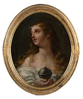 Una giovane Maria Maddalena è raffigurata con un vaso di unguenti contenente olio di nardo, utilizzato per ungere i piedi di Gesù.