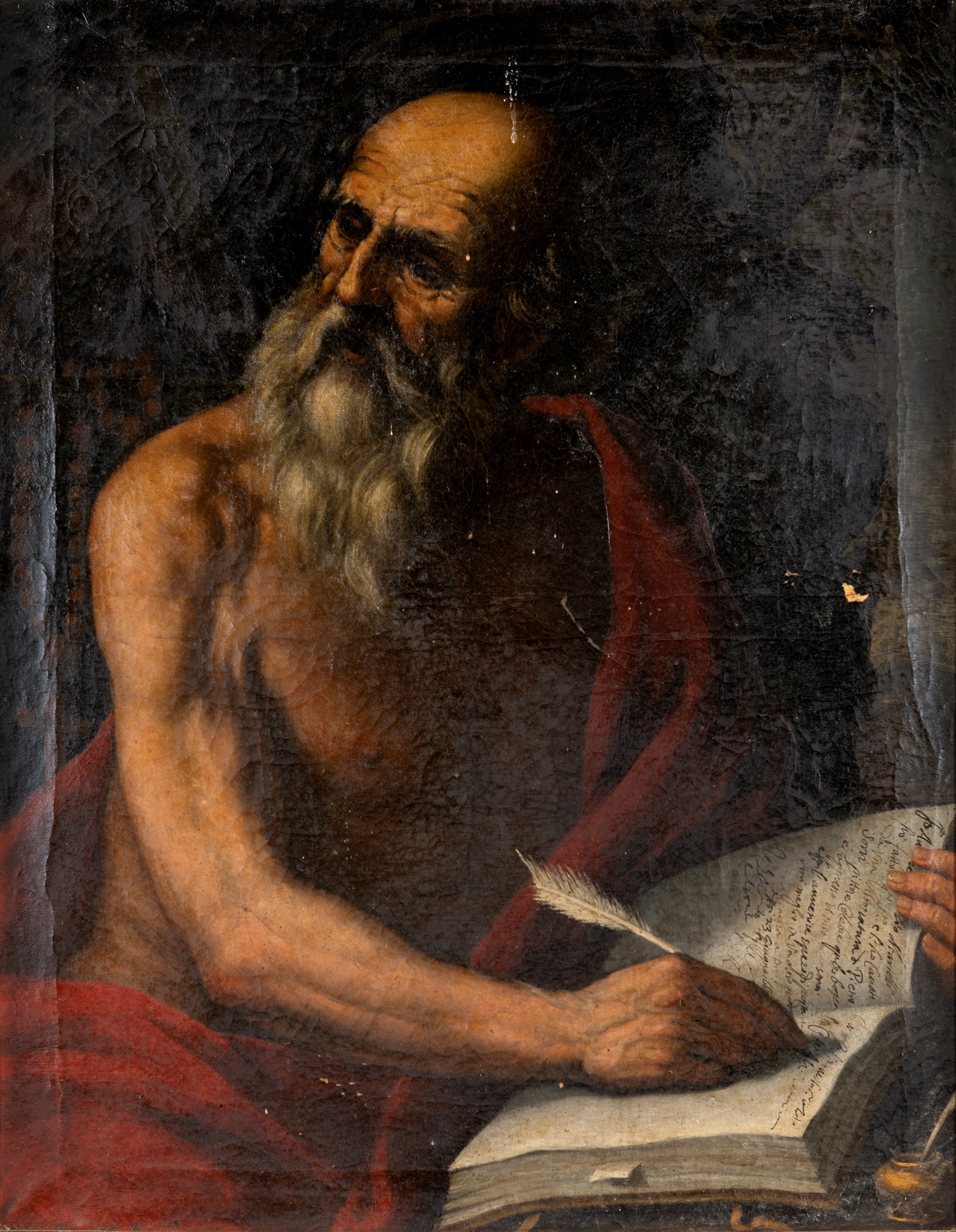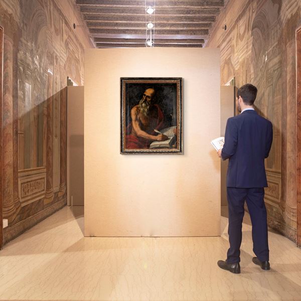 Questo quadro raffigura San Girolamo nello studio mentre scrive ed è firmato e datato da Aurelio Martelli, detto il Mutolo, pittore senese attivo nella seconda metà del Seicento. La firma autografa dell’artista appare sulla pagina del libro che il santo tiene tra le mani, come se fosse lo stesso San Girolamo a scriverla. Il testo, parzialmente illeggibile, recita: Io Aurelio Martelli ho fatto questo santo e l’ho cavato da una abbozzatura di Pietro Sorri, pittore celebre (...) l'avvenire (...) meglio in un altro quadro. Piacerà a Dio. 23 giugno 1663. La scritta rivela il metodo di lavoro di Martelli, che sviluppava le opere a partire da studi e abbozzi di maestri precedenti, seguendo le indicazioni del proprio insegnante. Questo documento diretto offre un raro esempio della sua pratica artistica e del legame con la tradizione pittorica senese del XVII secolo. Il quadro mostra attenzione ai dettagli, cura compositiva e un’esplicita espressione di devozione religiosa.