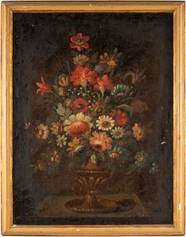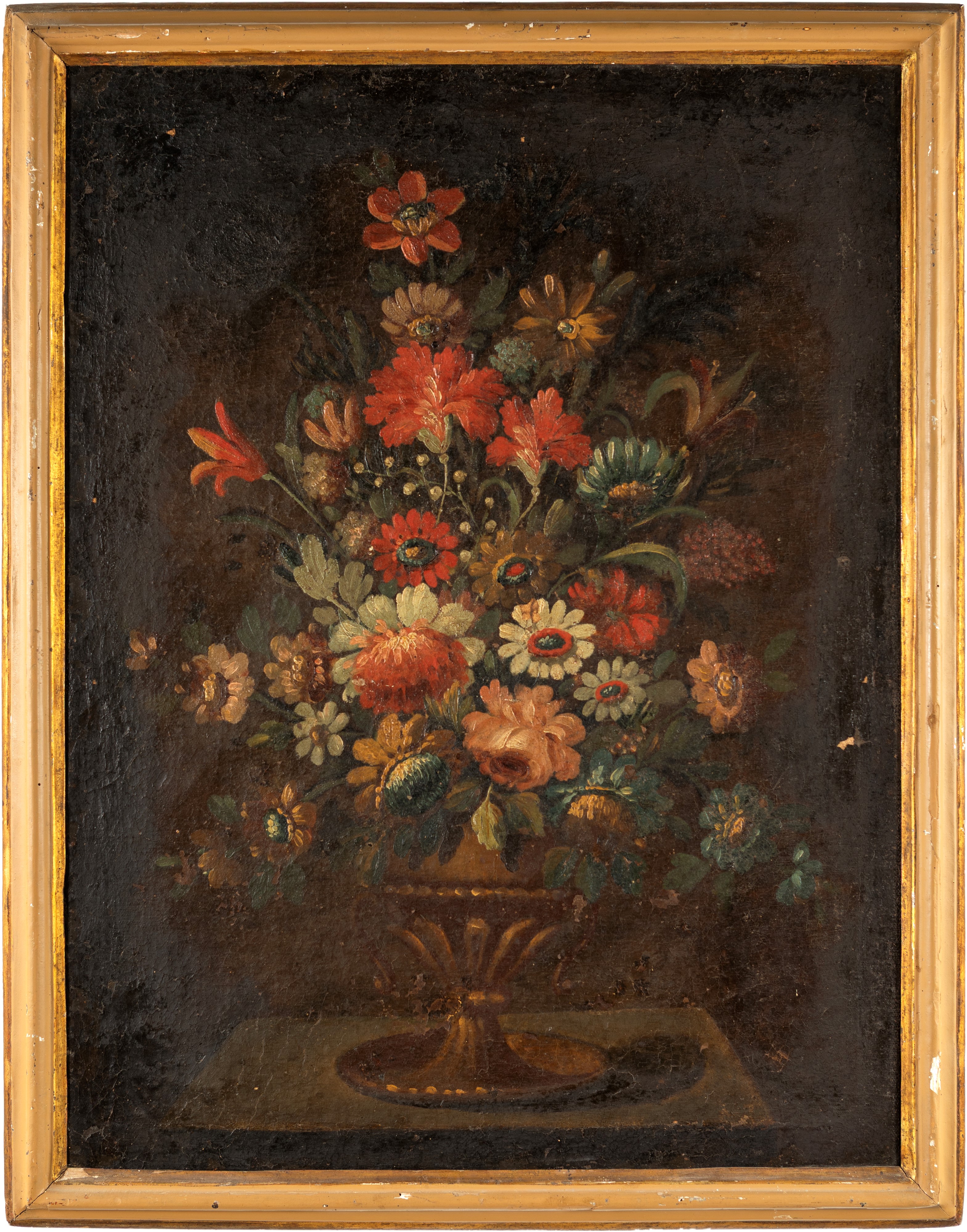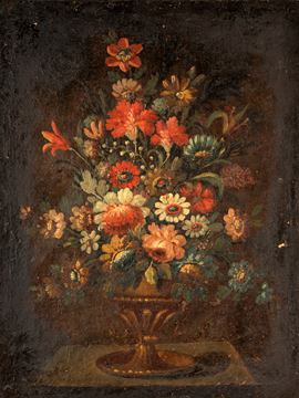 Su dei contenitori di rame battuto si aprono, come fuochi pirotecnici, le esplosioni di mazzi di fiori, le quali, con le loro espressioni variopinte, occupano due terzi dell'intera superficie pittorica, Il fondo è scuro e oltre al vaso si distingue solo il piccolo tavolo di appoggio in tralice.
