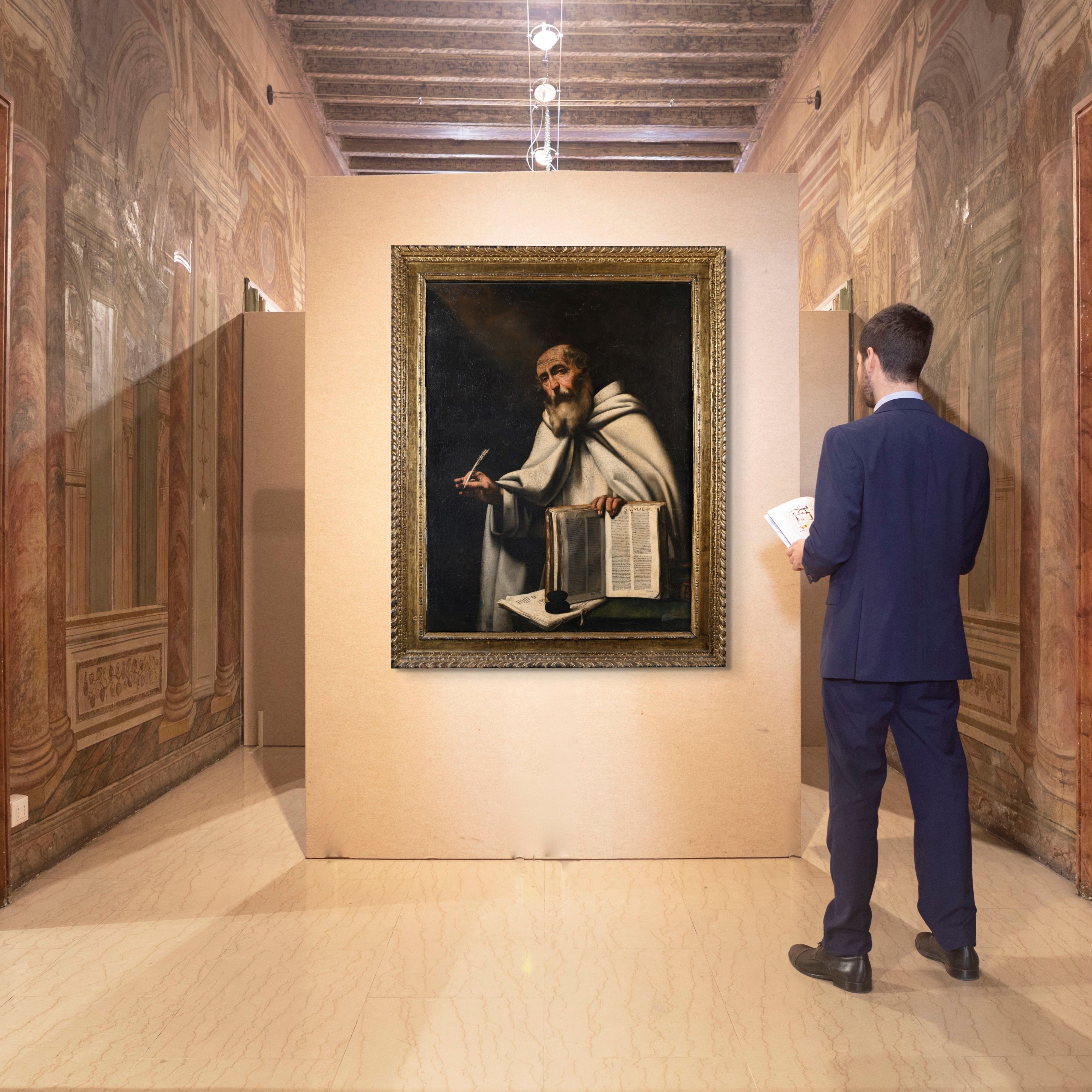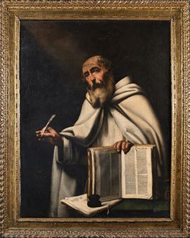 Ritratto isolato di San Guglielmo di Malavalle, eremita e fondatore dell’ordine dei Guglielmiti, raffigurato in abito monastico. Nella mano destra tiene una piuma, mentre nella sinistra regge un libro con l’iscrizione S. GUGLIEM e alcune lettere e iniziali in parte illeggibili. Lo sfondo scuro e neutro, la luce drammatica che modella il volto e le mani, e la resa realistica dei lineamenti richiamano lo stile di Jusepe de Ribera, caratterizzato dall’uso intenso del chiaroscuro e dal forte effetto drammatico. L'opera, di grande qualità, presenta una strettissima relazione con il celebre San Bartolomeo di Ribera conservato al Museo del Prado di Madrid. La composizione, concentrata sul solo santo, esalta la dignità e la meditazione interiore del soggetto, rendendo l’opera particolarmente adatta a un contesto devozionale.