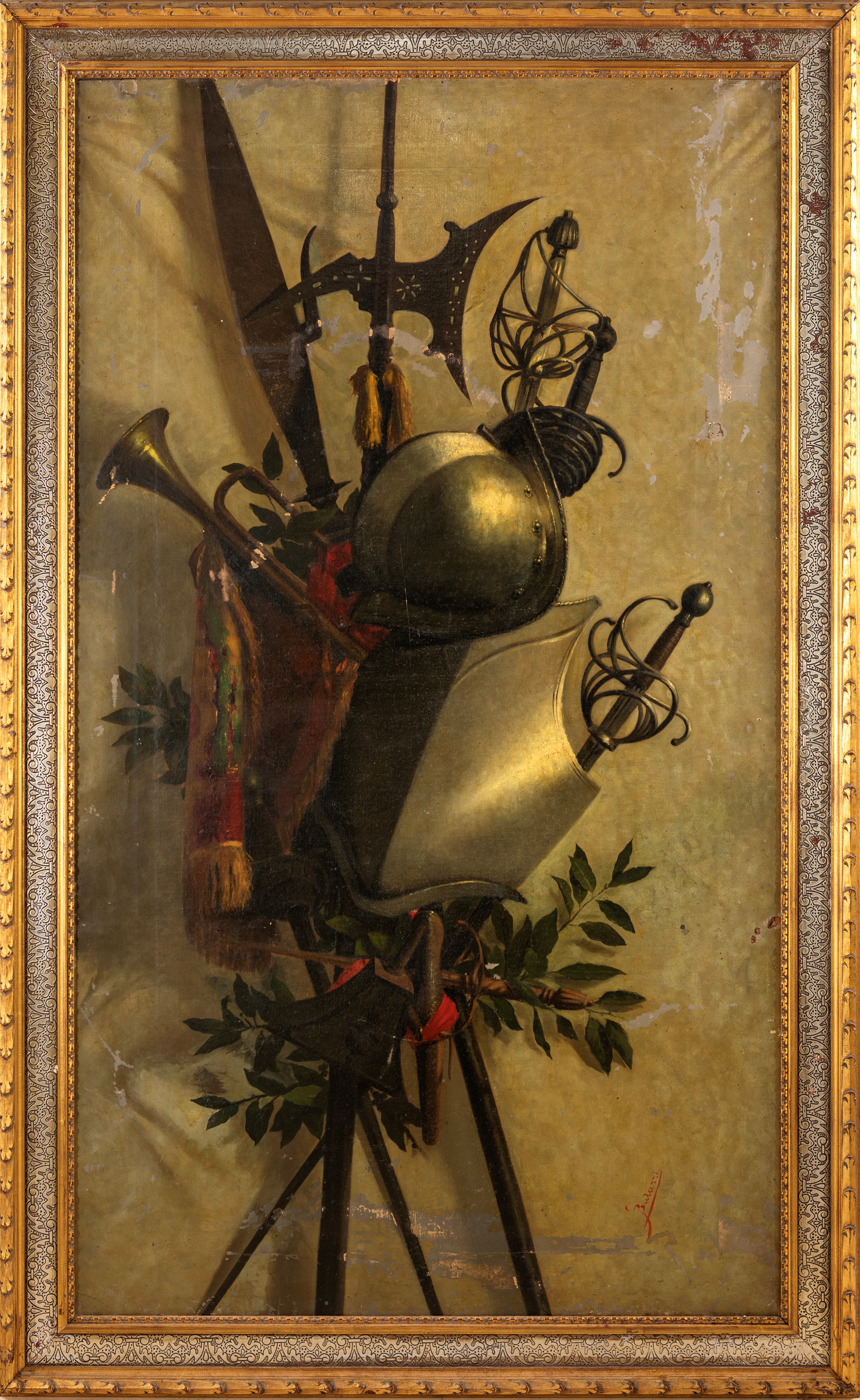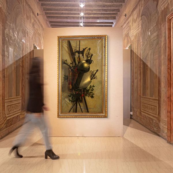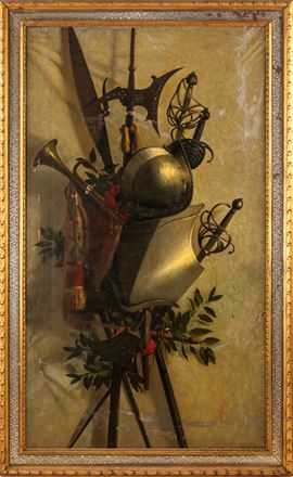 L’opera raffigura un trofeo d’armi, con corazza, elmo, spade e alabarde disposti con raffinata costruzione scenica su fondo neutro. La resa metallica delle superfici e la cura descrittiva dei dettagli – dalla lucentezza del ferro alle piume e ai nastri colorati – rivelano una notevole perizia pittorica e un gusto per il trompe-l’œil, tipico della pittura accademica ottocentesca.
