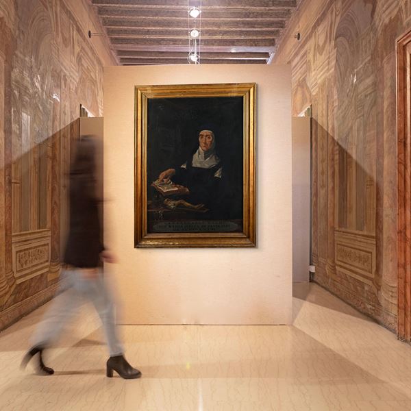 Il dipinto raffigura la Beata Josefa Maria de Santa Inés (1625–1696), religiosa agostiniana nata a Benigànim, presso Valencia, nota per la sua vita di umiltà e devozione e beatificata da papa Leone XIII nel 1888. La Beata è rappresentata in atteggiamento meditativo, mentre tiene tra le mani un libro aperto, identificabile con il libro dell’Ufficio Divino, sul quale con l’indice della mano destra traccia il segno della croce; sul frontespizio è visibile la stampa devozionale della “O”, popolarmente detta el Redondet, che le permetteva, pur essendo analfabeta, di recitare l’Ufficio Divino in coro guardando l’immagine sacra. Il forte contrasto luministico che illumina volto e mani, immersi in un ambiente sobrio e raccolto, rimanda alla pittura devozionale valenciana del XVIII secolo, vicina al gusto tenebrista della tradizione spagnola. Il soggetto conobbe ampia diffusione iconografica tra XVIII e XIX secolo, come testimoniano numerose incisioni devozionali, una variante a matita di Vicente López Portaña conservata al Museo del Prado di Madrid e una replica ottocentesca nella chiesa di San Silvestro in Capite a Roma.
