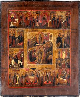 Questa icona russa del XIX secolo raffigura le cosiddette Dodici Feste, ovvero le principali solennità dell’anno liturgico della Chiesa Ortodossa. La composizione segue una struttura canonica, con dodici riquadri disposti attorno a una scena centrale che rappresenta la Risurrezione di Cristo nella sua forma più diffusa nell’iconografia ortodossa: la Discesa agli Inferi (Anastasis), simbolo della vittoria sulla morte.