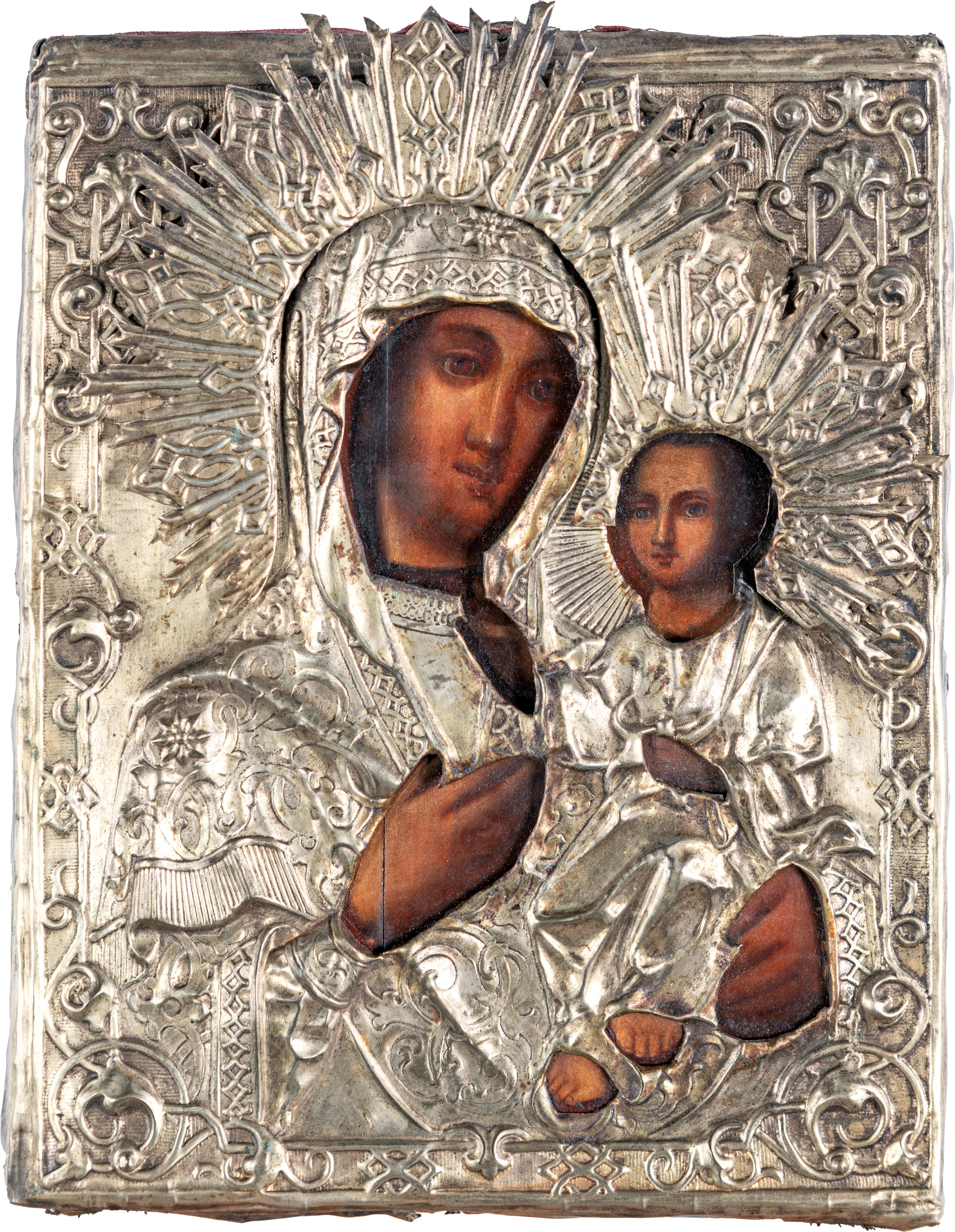 Si tratta di un’icona russa del XIX secolo raffigurante la Vergine col Bambino, arricchita da una preziosa copertura metallica decorativa, finemente lavorata con tecniche di filigrana e incisione, che conferiscono all’opera un ricco apparato ornamentale. La cornice, concepita per esaltare la sacralità dell’immagine, lascia visibili soltanto i volti e le mani delle figure sacre, sottolineando il ruolo centrale della devozione e della contemplazione nell’arte religiosa ortodossa.