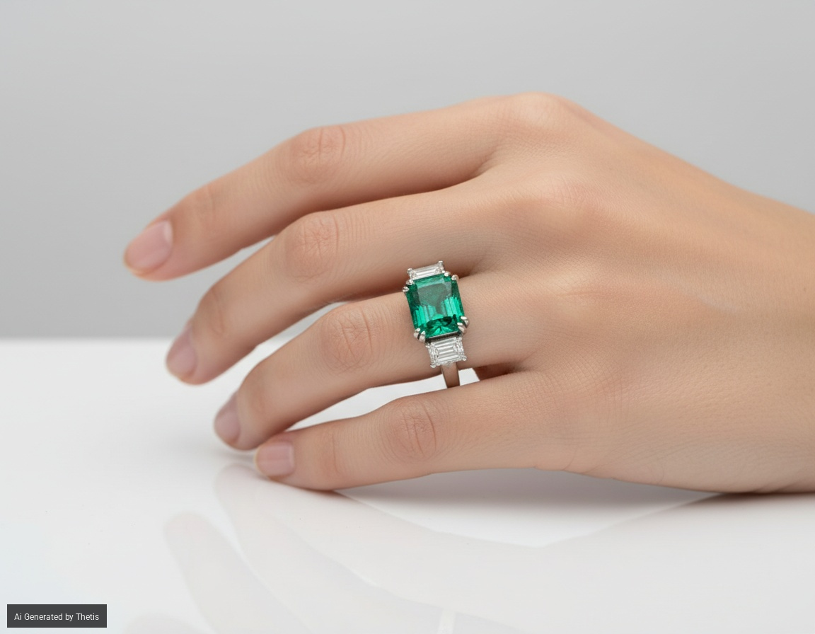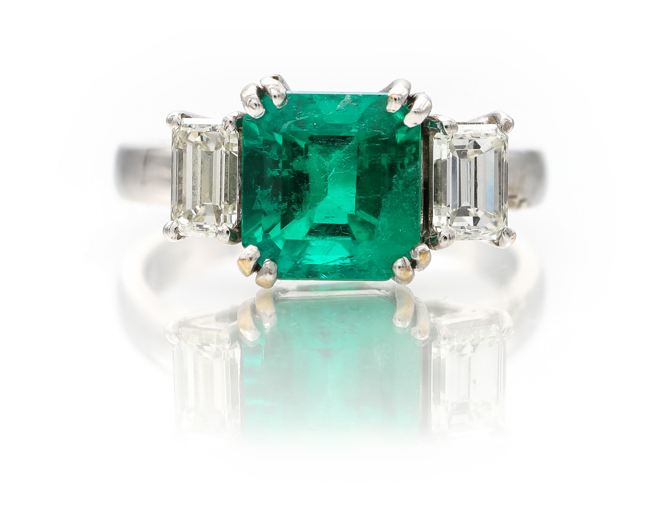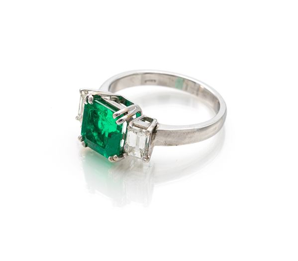 Anello con smeraldo colombiano in taglio smeraldo e baguettes.