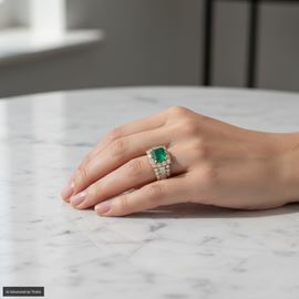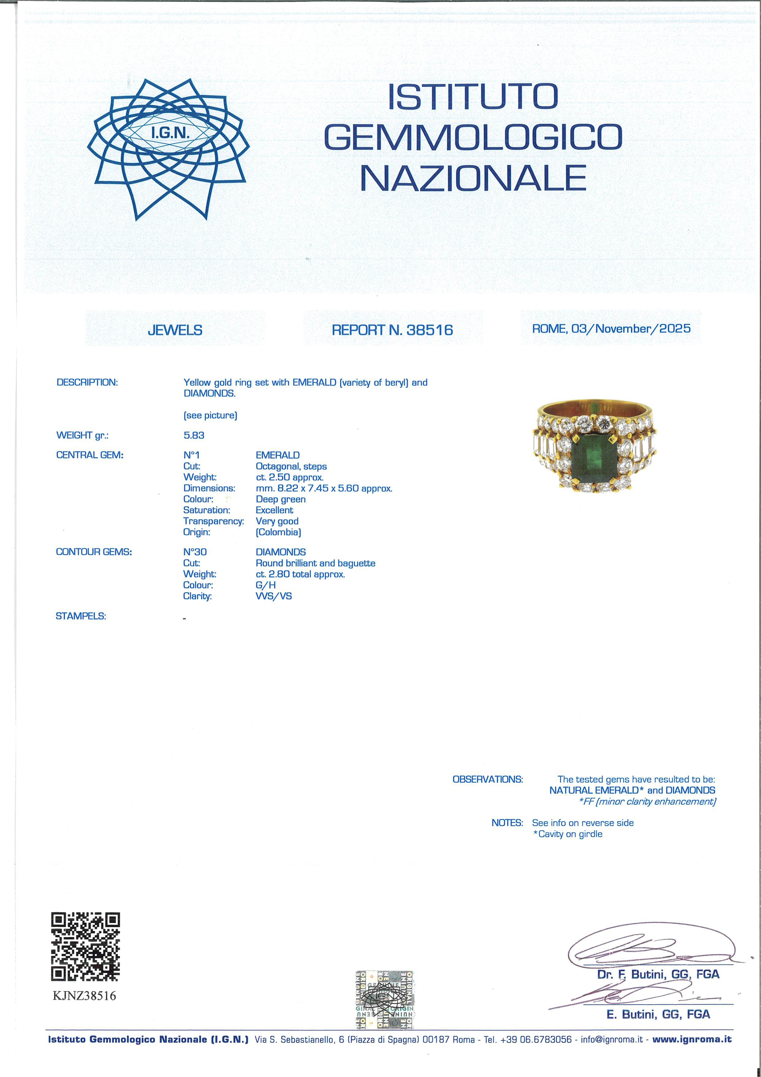 Oro giallo 750/000. Smeraldo naturale Colombia, MINOR CLARITY ENHANCEMENT, in taglio ottagonale ct. 2,50, diamanti ct. 2,80 G-H, VVS,VS. Corredato di certificazione gemmologica IGN n° 38516 del 03/11/2025.