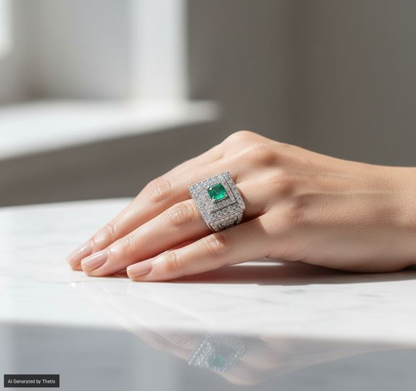 Oro bianco 750/000. Diamanti in taglio rotondo brillante ct 1,30. Smeraldo ct 1 ca. Peso complessivo gr 13,80. Reca bolli di importazione francese