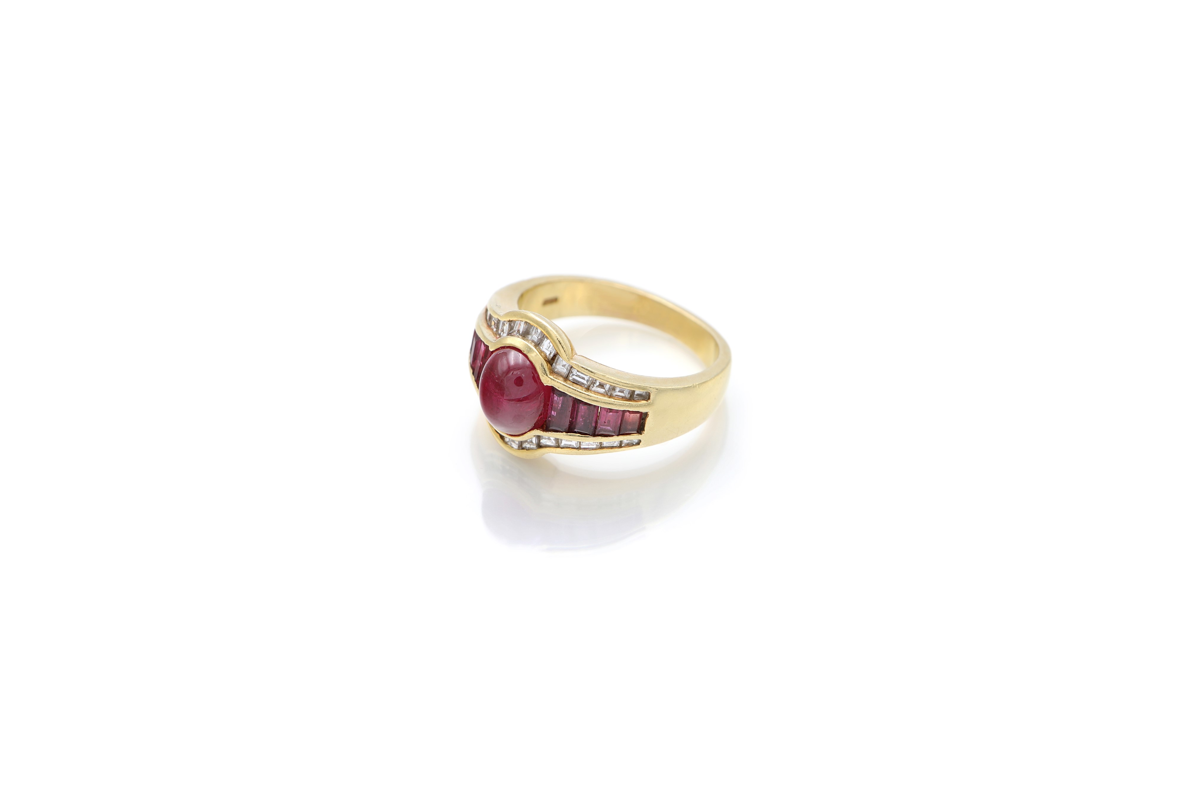 Oro giallo 750/000. Rubino centrale in taglio cabochon e rubini in taglio carré. Peso complessivo gr 7,30