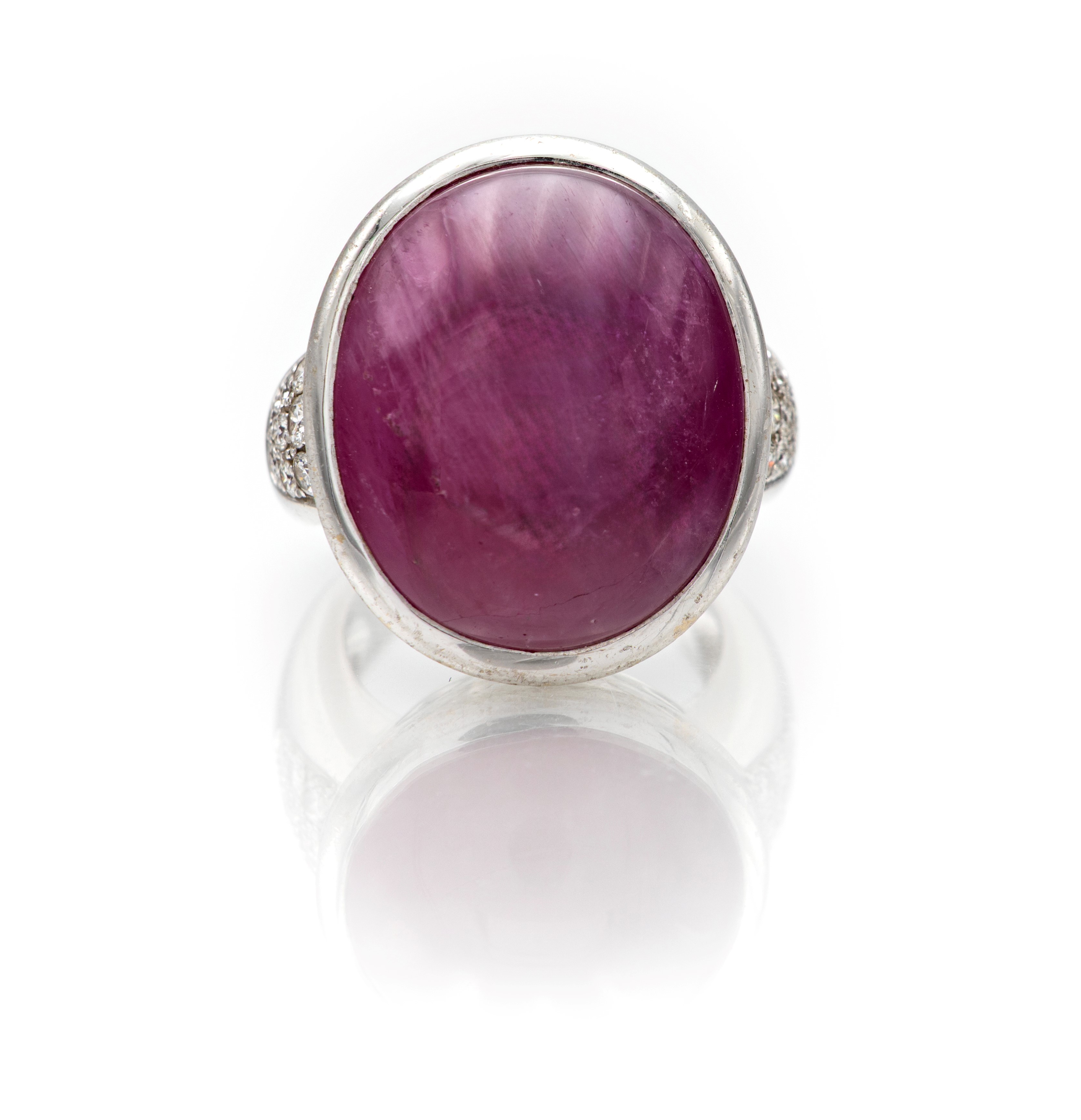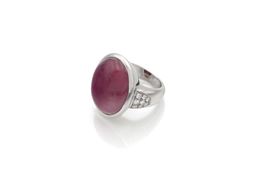 Oro bianco 750/000. Rubino in taglio cabochon ct. 14 ca., diamanti ct 0,50. Peso complessivo gr 21,10