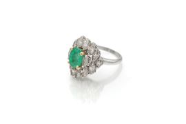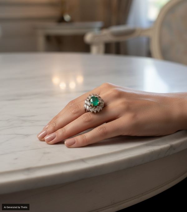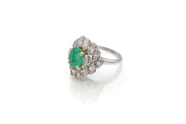 Oro bianco 750/000. Diamanti in taglio navette ct. 3,20. Smeraldo in taglio ovale ct. 1,70. Peso complessivo gr. 6,80.