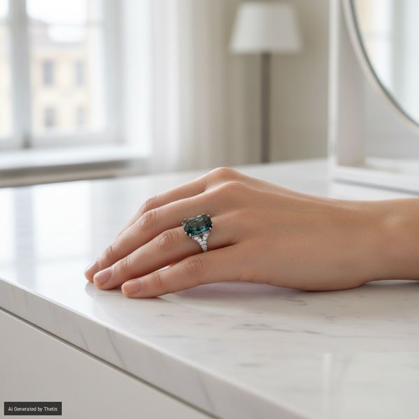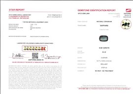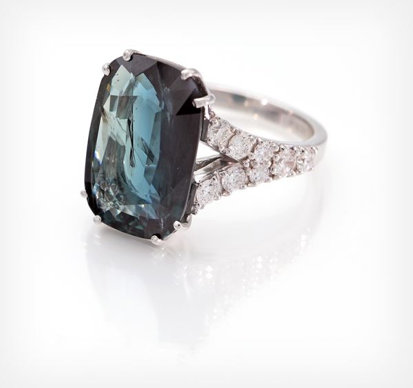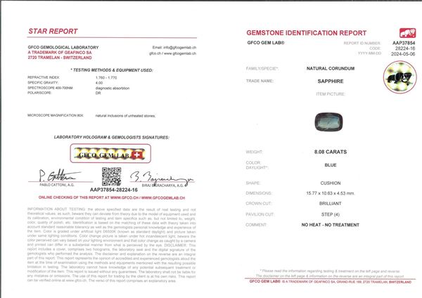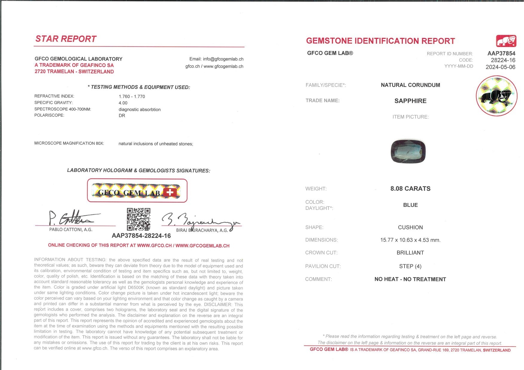 Oro bianco 750/1000. Diamanti in taglio rotondo brillante ct. 0,80 ca. Zaffiro in taglio cuscino ct 8,08, NO INDICATION OF HEATING. Peso complessivo gr. 6,50. Corredato di certificazione gemmologica CFCO n° AAP37854.