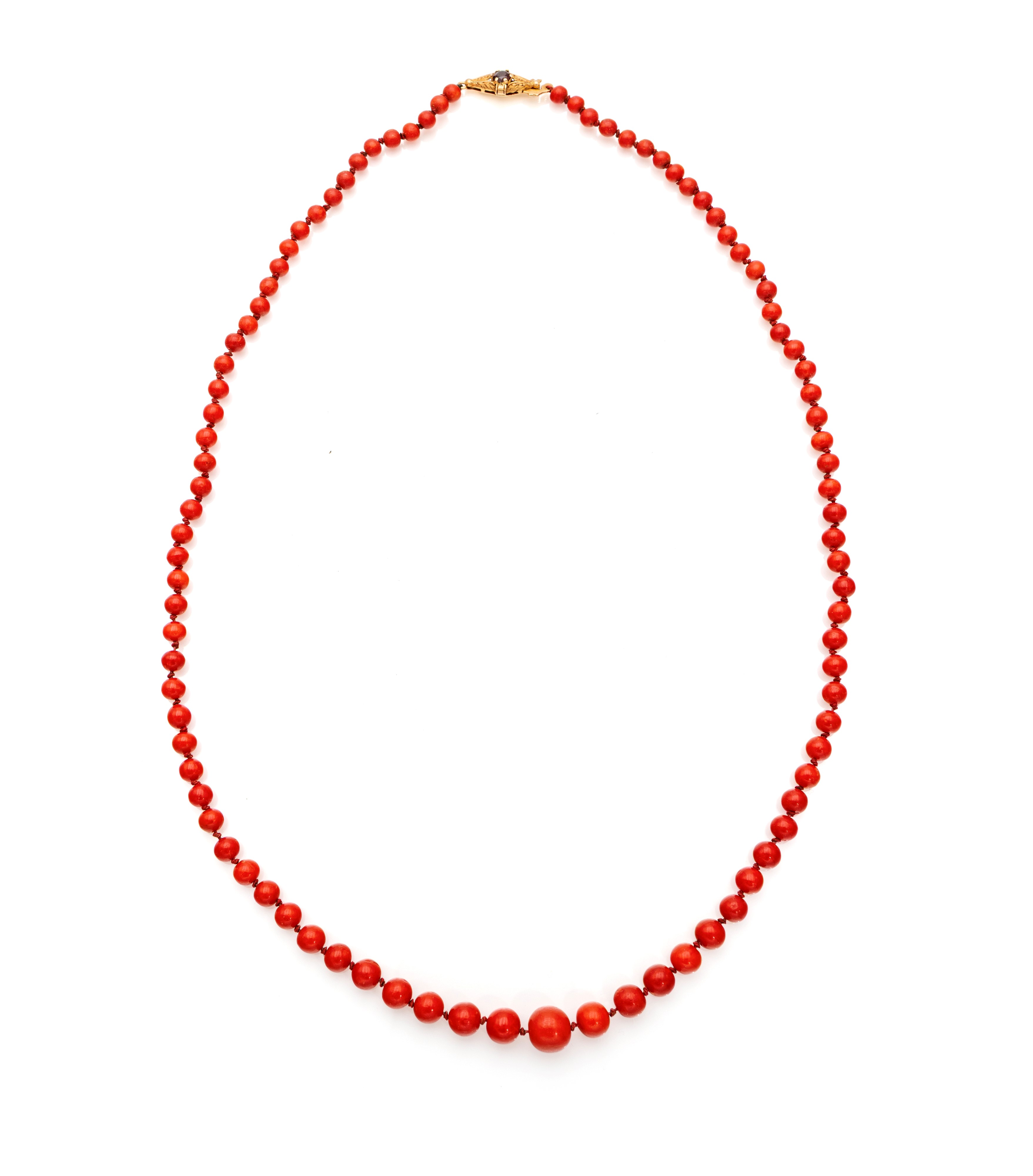 Oro giallo 750/000. Corallo rosso in taglio sferico da mm. 5 a mm. 10. Peso complessivo gr. 27,40.