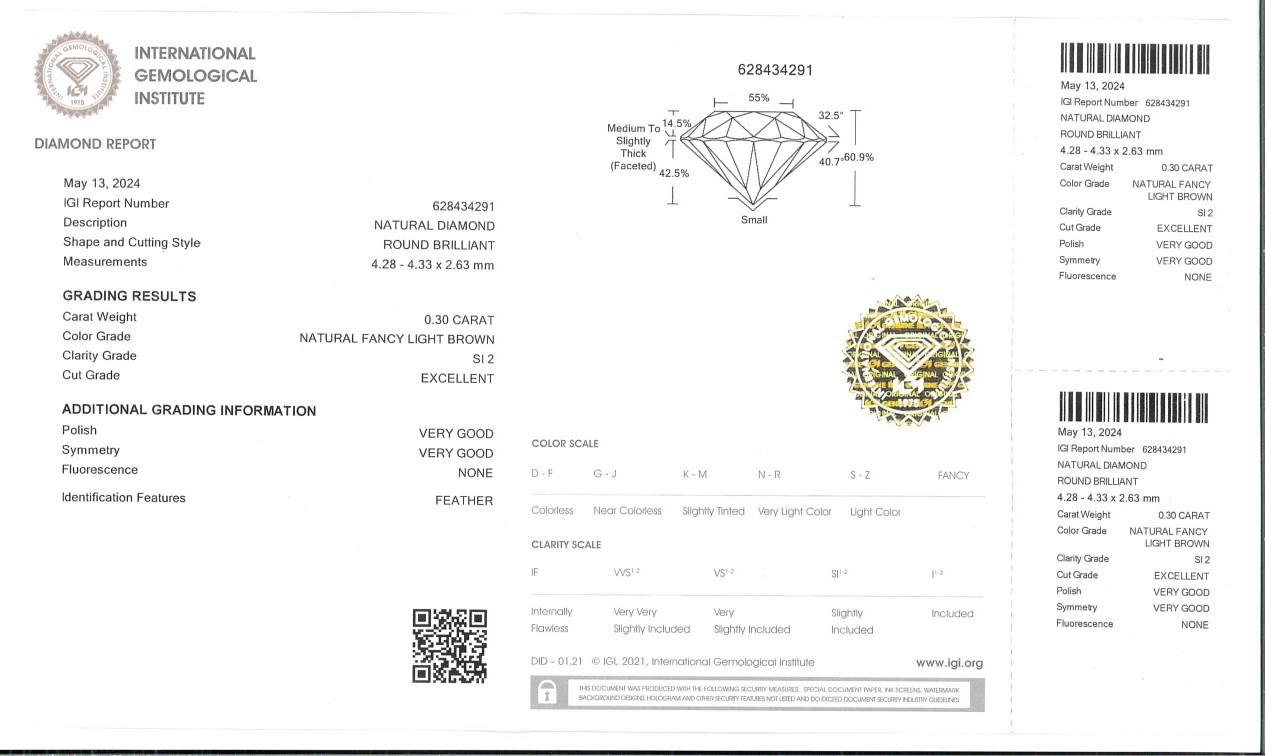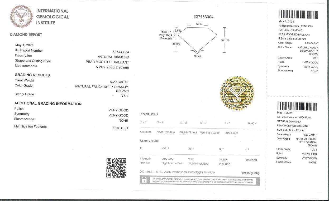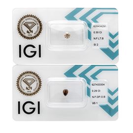 Diamanti naturali fancy color, ct 0,30 in taglio rotondo e ct. 0,29 in taglio goccia. Corredati di certificazione gemmologica IGI.