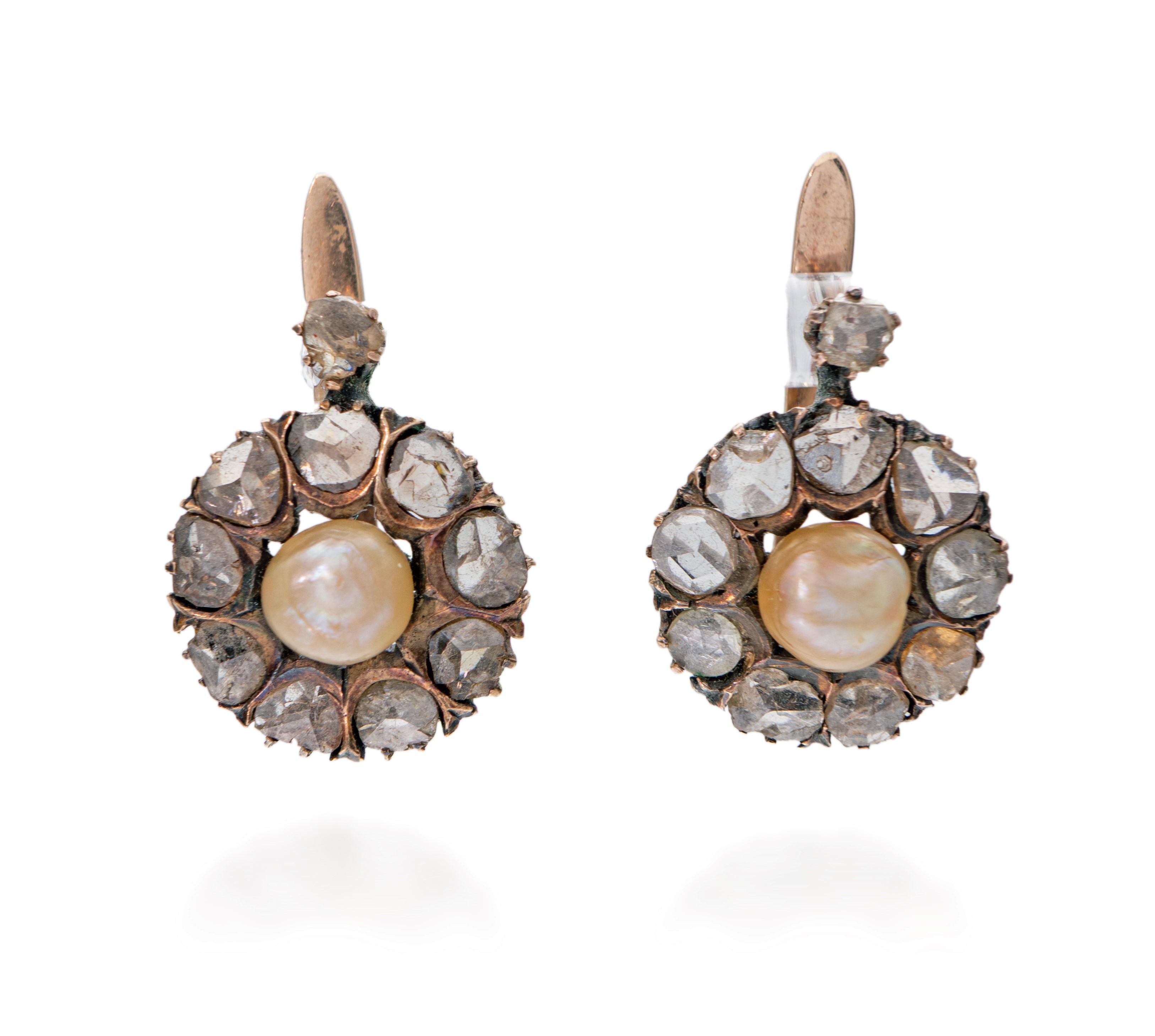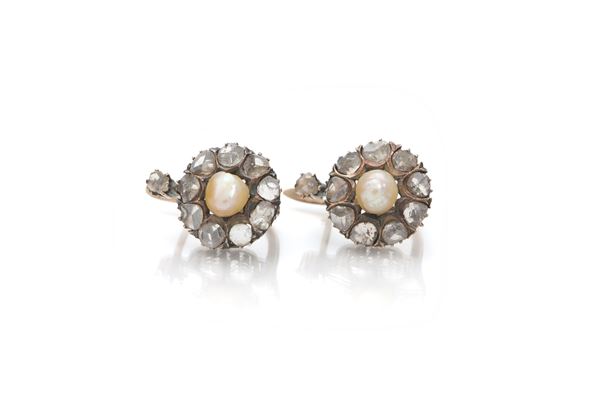 Coppia di orecchini a monachina in oro, perle naturali e diamanti