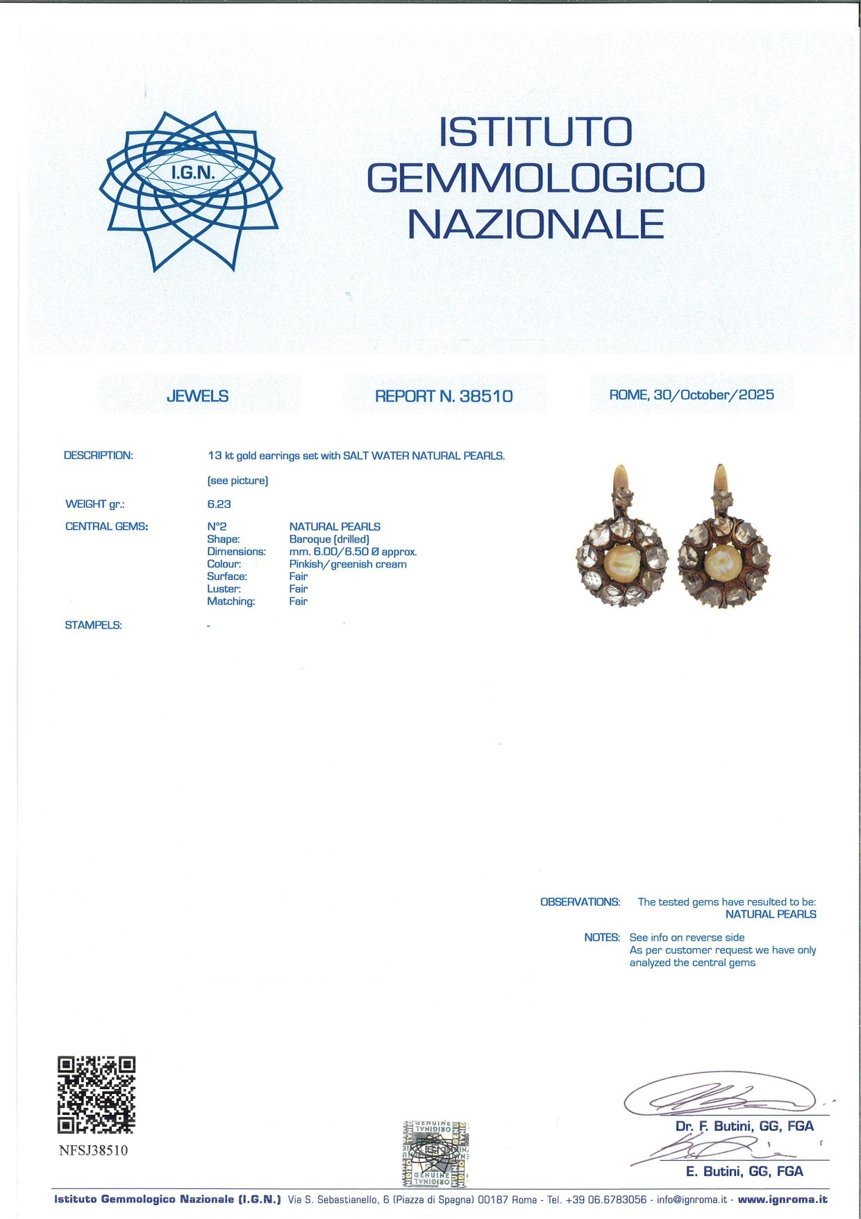 Oro giallo 13 kt. Perle naturali spontanee mm. 6/6,5. Peso complessivo gr. 6,20. Corredate di certificazione gemmologica IGN n° 38510 del 30/10/2025.
