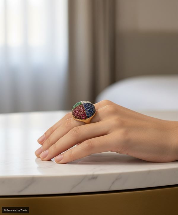 Grande anello in oro, brillanti, zaffiri, rubini e smeraldi