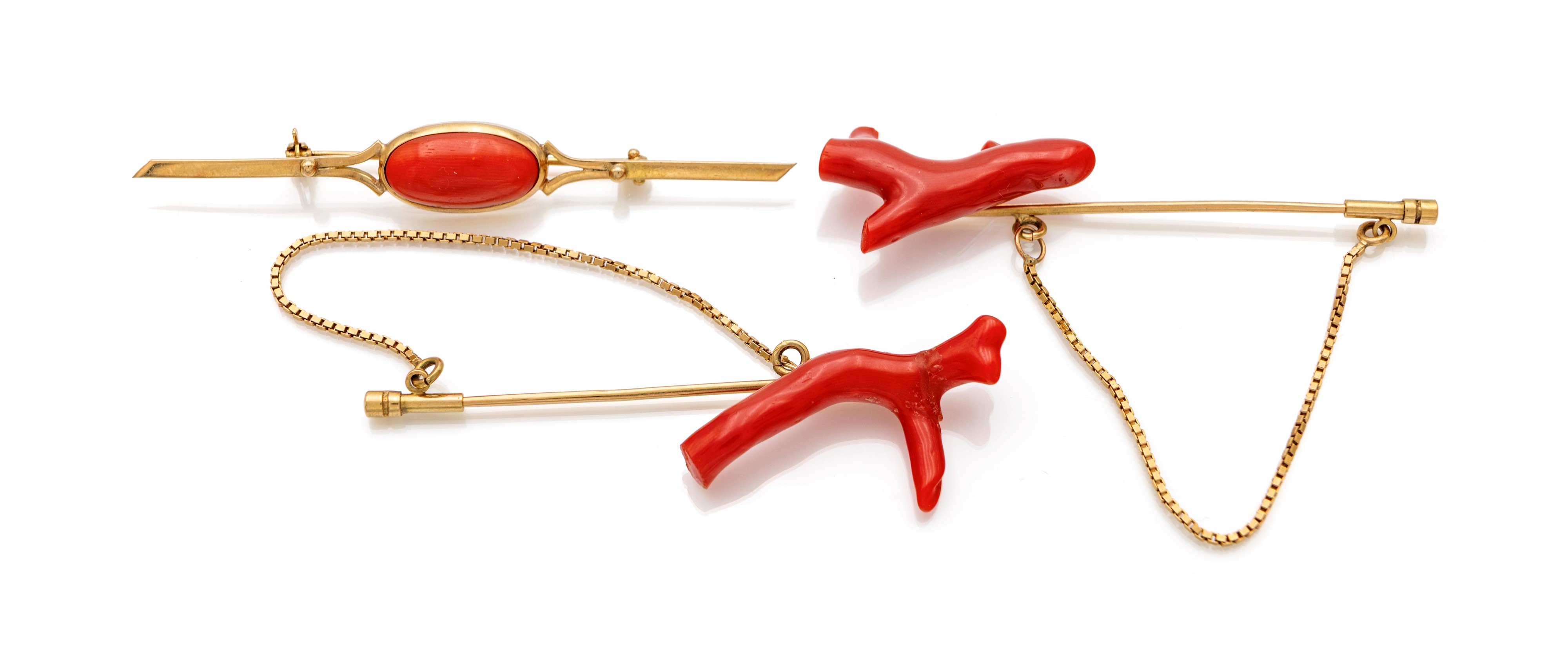 Gruppo di tre spille in oro e corallo