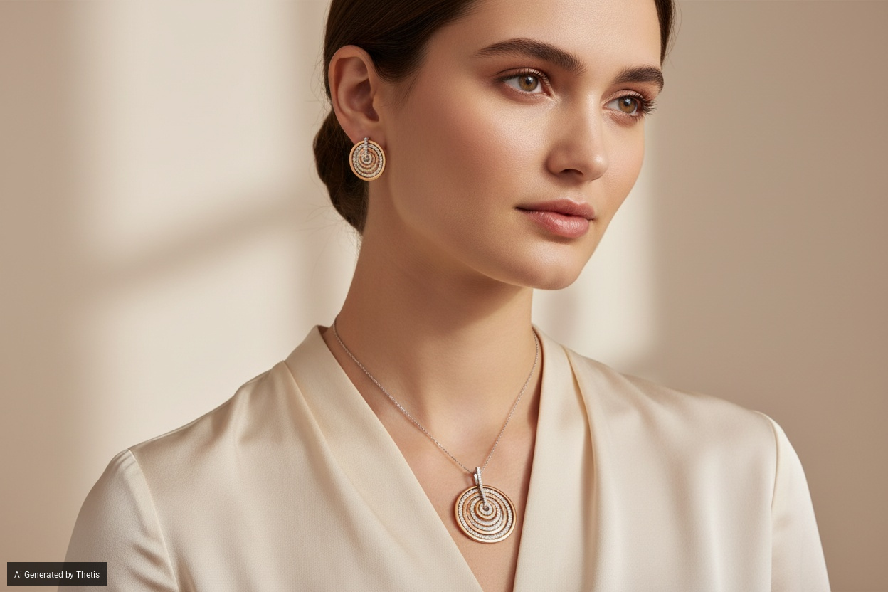 Parure di pendente e coppia di orecchini a cerchi concentrici in oro e brillanti