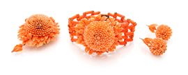 Oro giallo 585/000. Parure composta da bracciale, Spilla-pendente ed orecchini. Corredata di custodia originale.