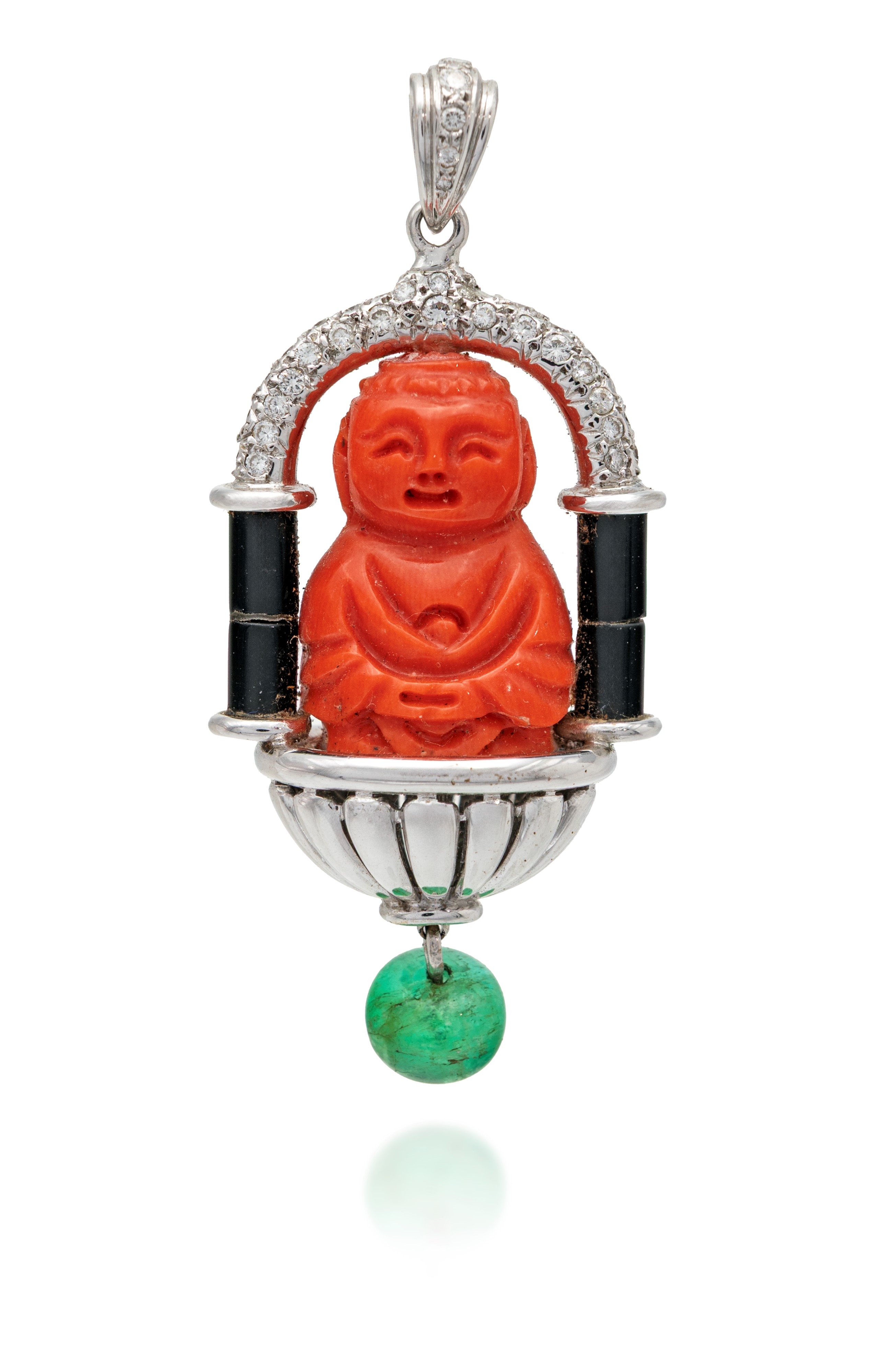 Pendente in oro, corallo, brillanti, onice, smeraldo