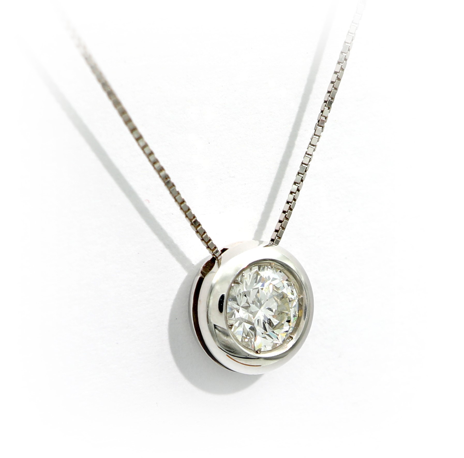 Oro bianco 750/000. Diamante solitario centrale in taglio rotondo brillante ct 0,90 ca, prob. G-H,VVS1. Peso complessivo gr 3,70