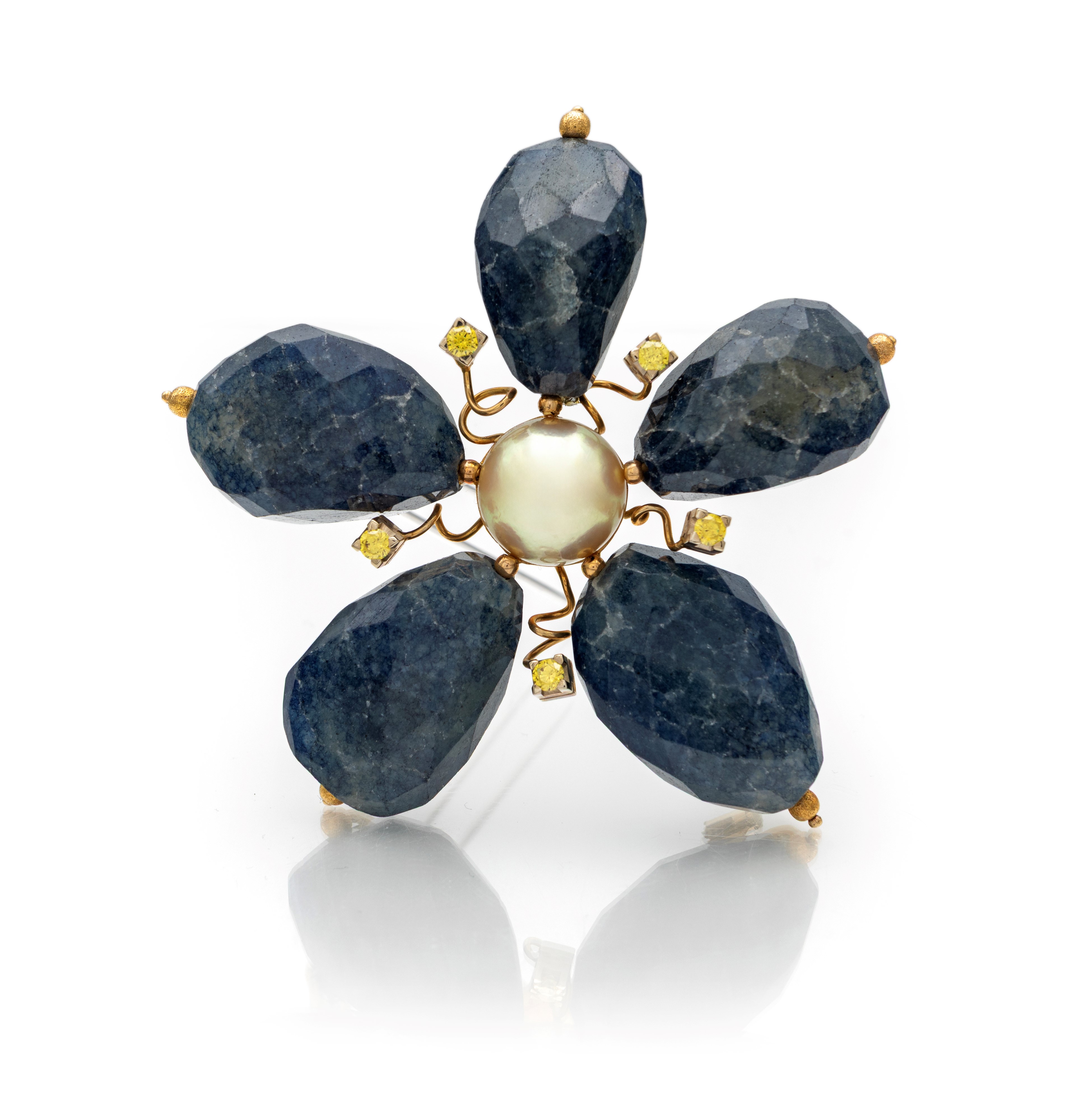 Spilla a fiore in oro giallo, calcedonio blu e quarzi citrini