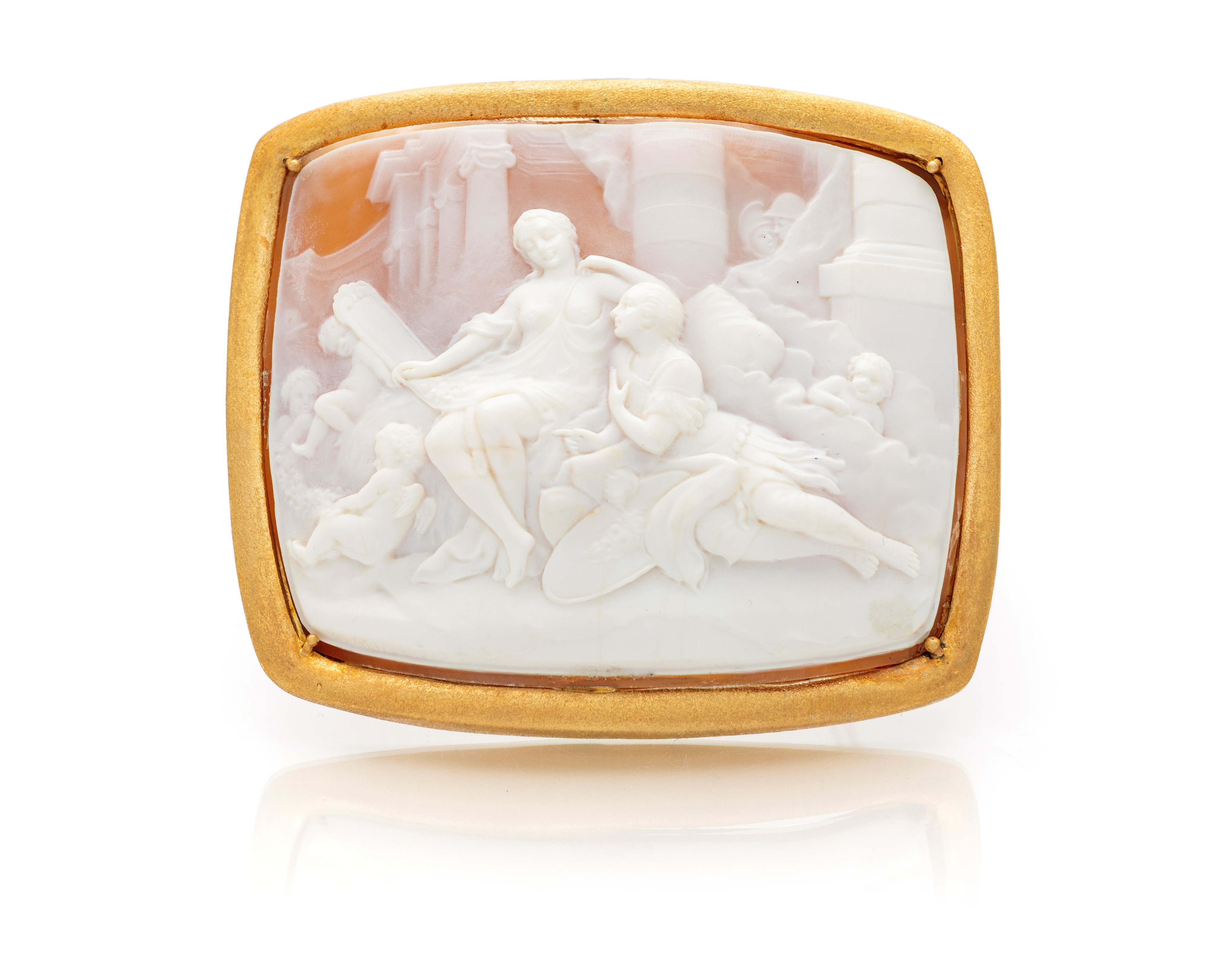 Oro giallo 750/000. Cammeo su conchiglia raffigurante scena allegorica, firmato C. Manasio.