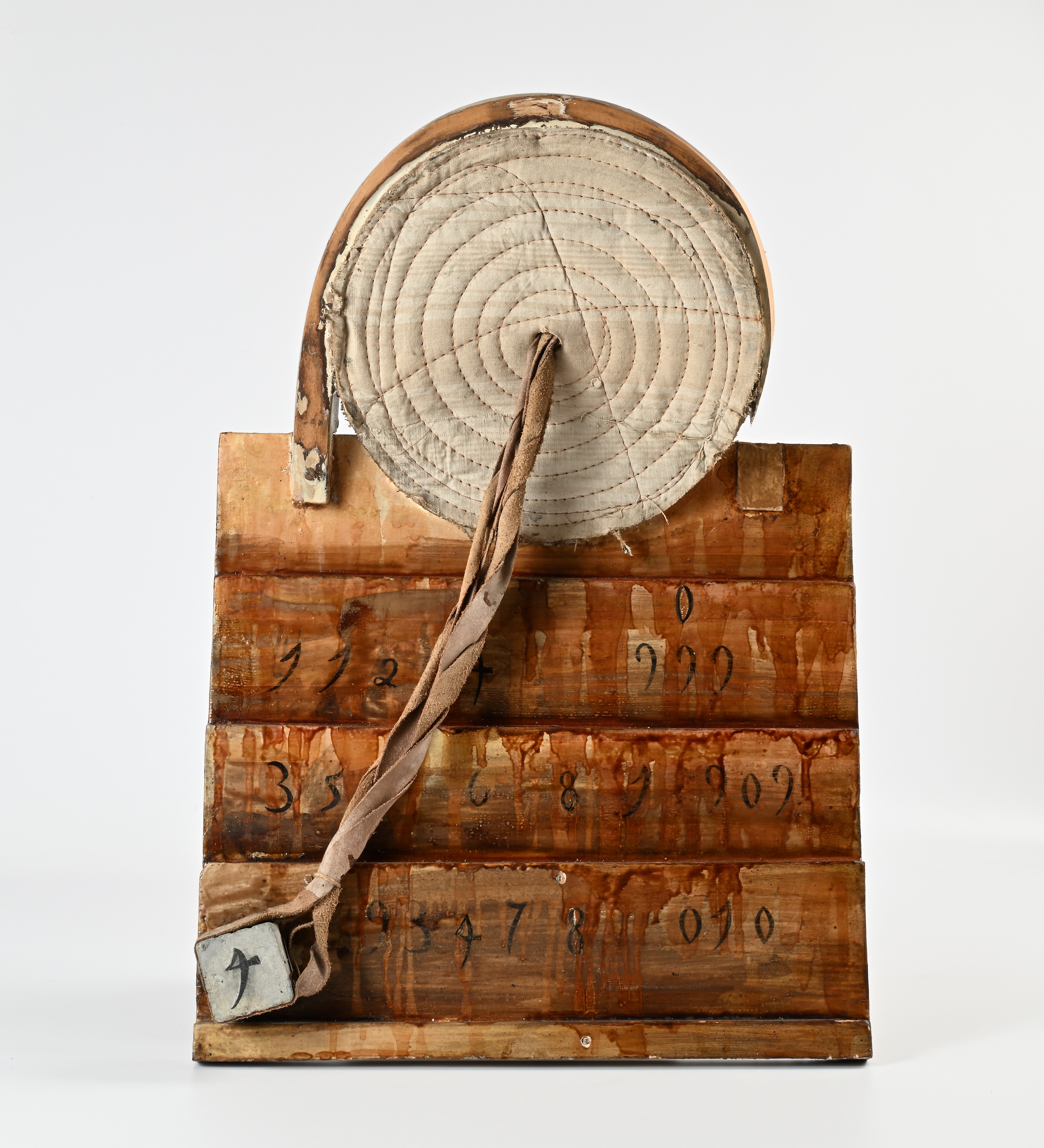 Pittura su tavola di legno, assemblaggio di cuoio e tessuto
