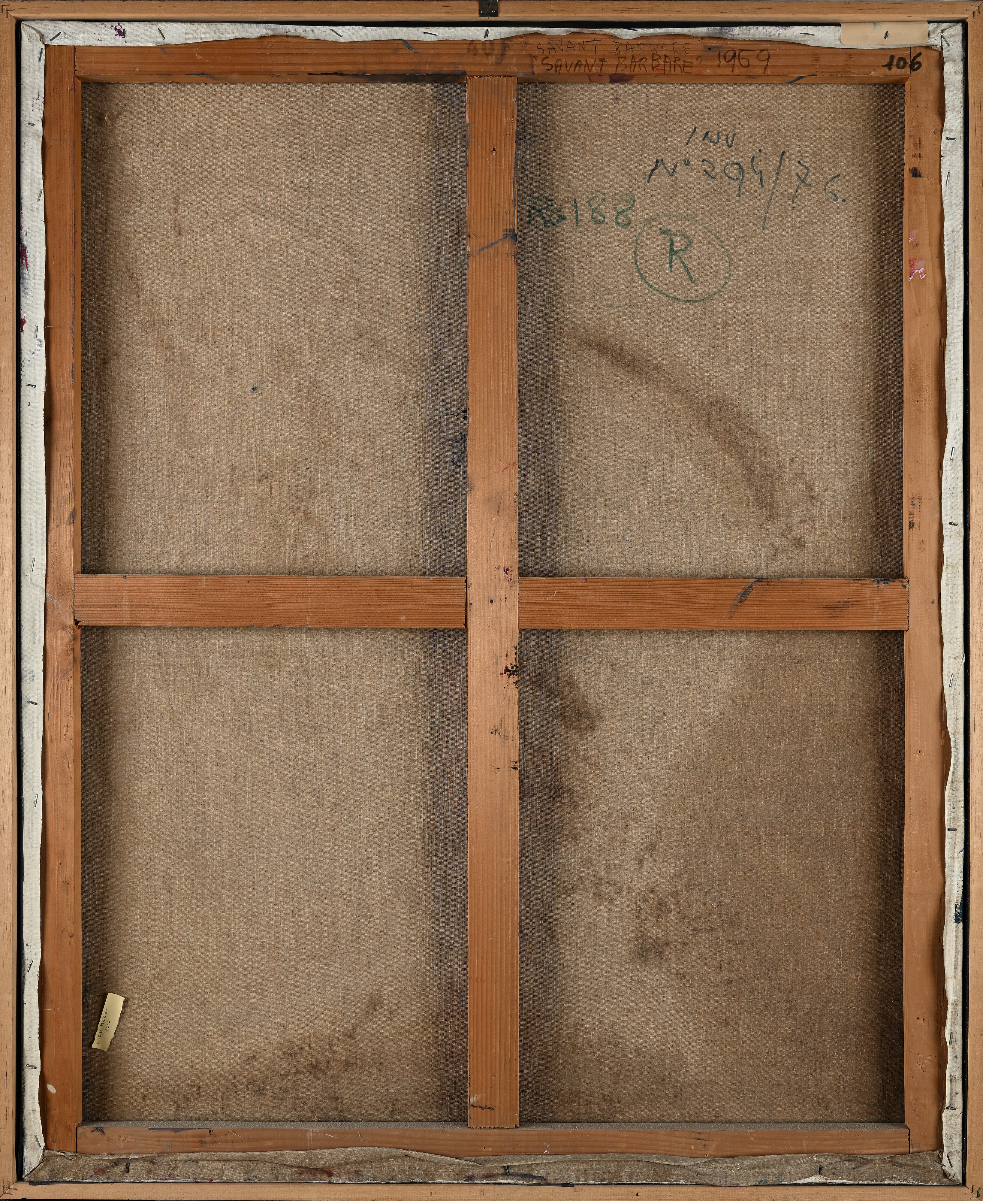 Titolo al retro sul telaio. Al verso sulla tela reca indicazioni e numeri di inventario.