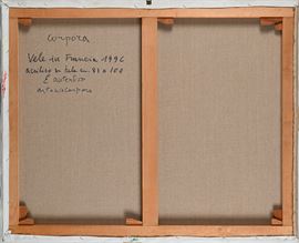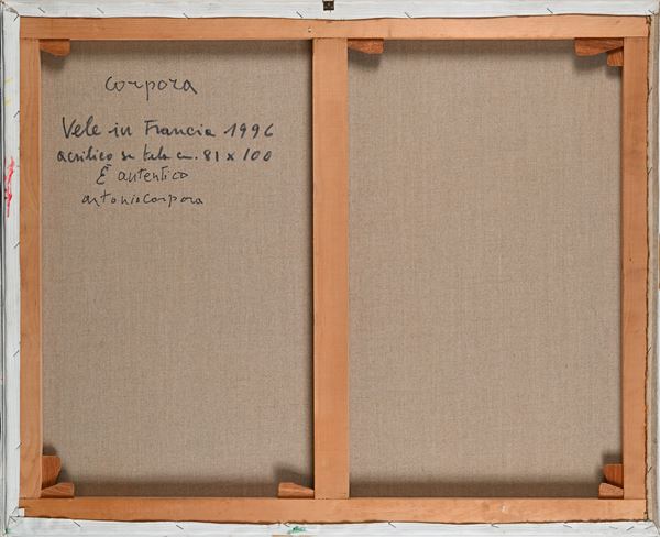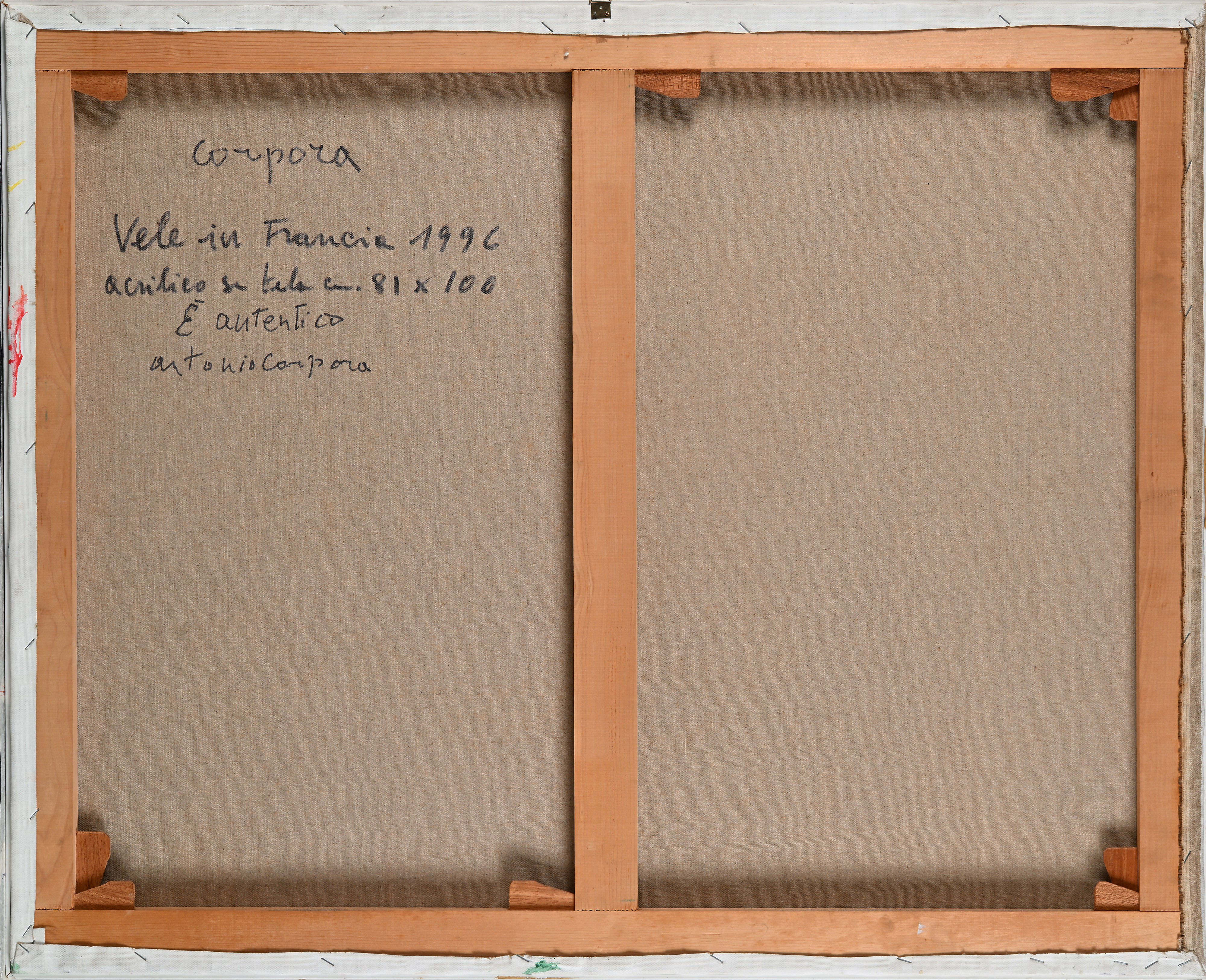 Firma in basso a destra "Corpora". Al verso reca firma, titolo, anno e autentica di pugno dell'artista
