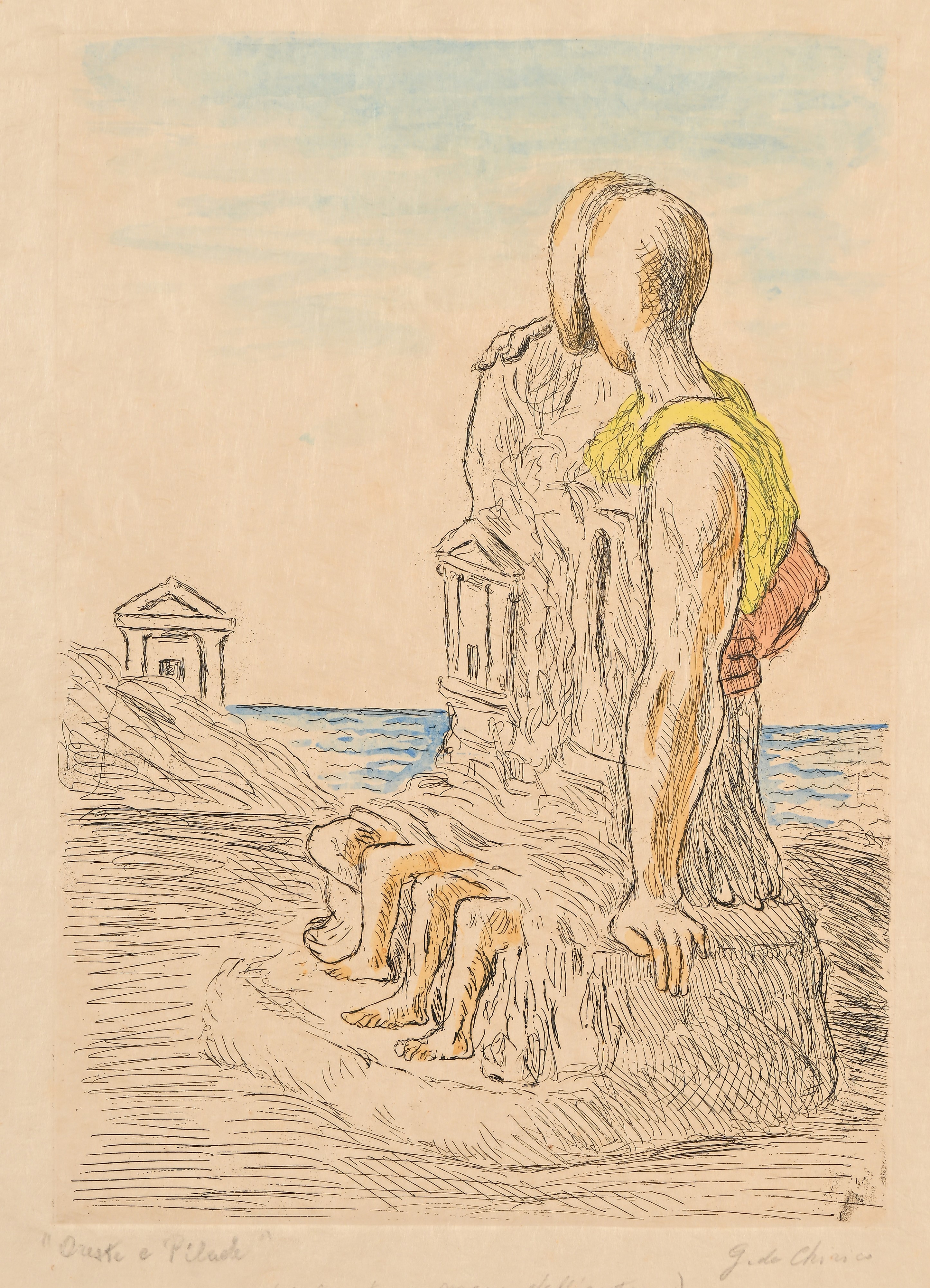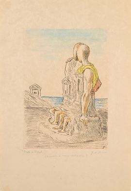 Firma, titolo e numerazione "G. De Chirico, Oreste e Pilade, Colorata a mano dall'autore". Timbro a secco "Alberto Caprini Stampatore in Roma" e "Giorgio De Chirico"