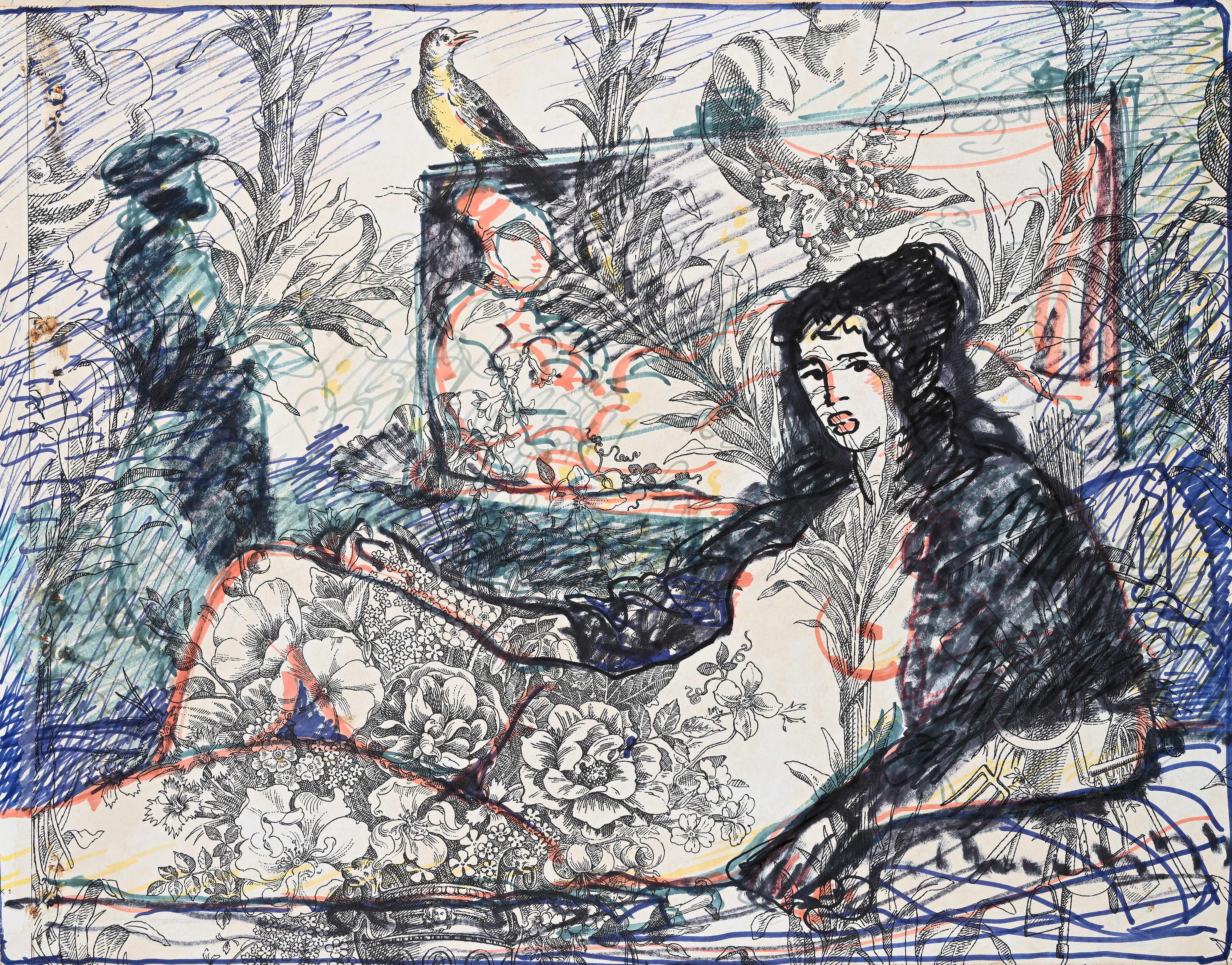 Pennarelli su carta (serigrafata a motivi floreali e vegetali) su tavola