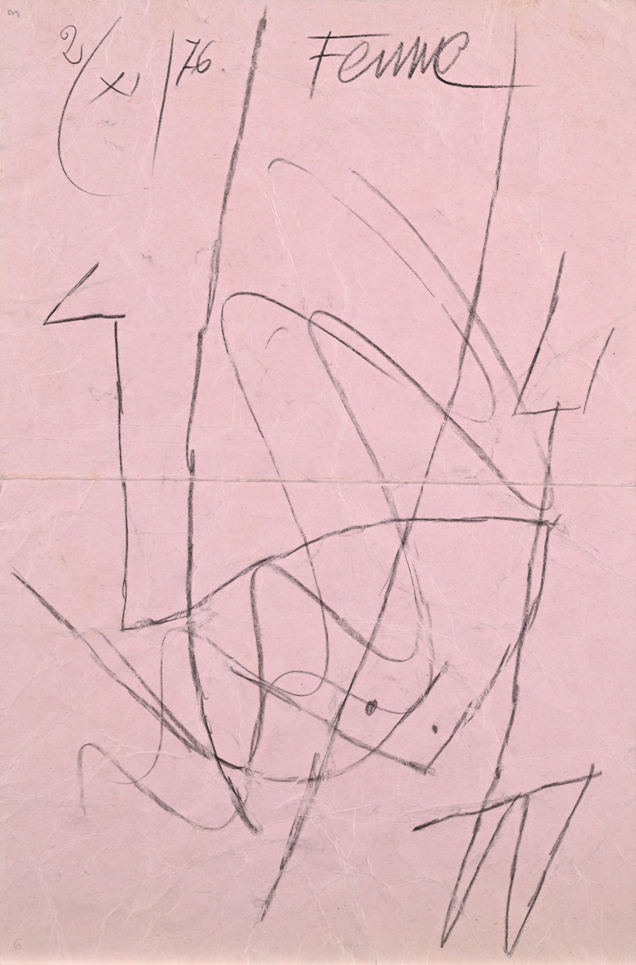 Firma in basso a destra "Mirò". Al verso reca un'altro disegno a matita e, in alto, il titolo e la data "2/XI/76, Femme".