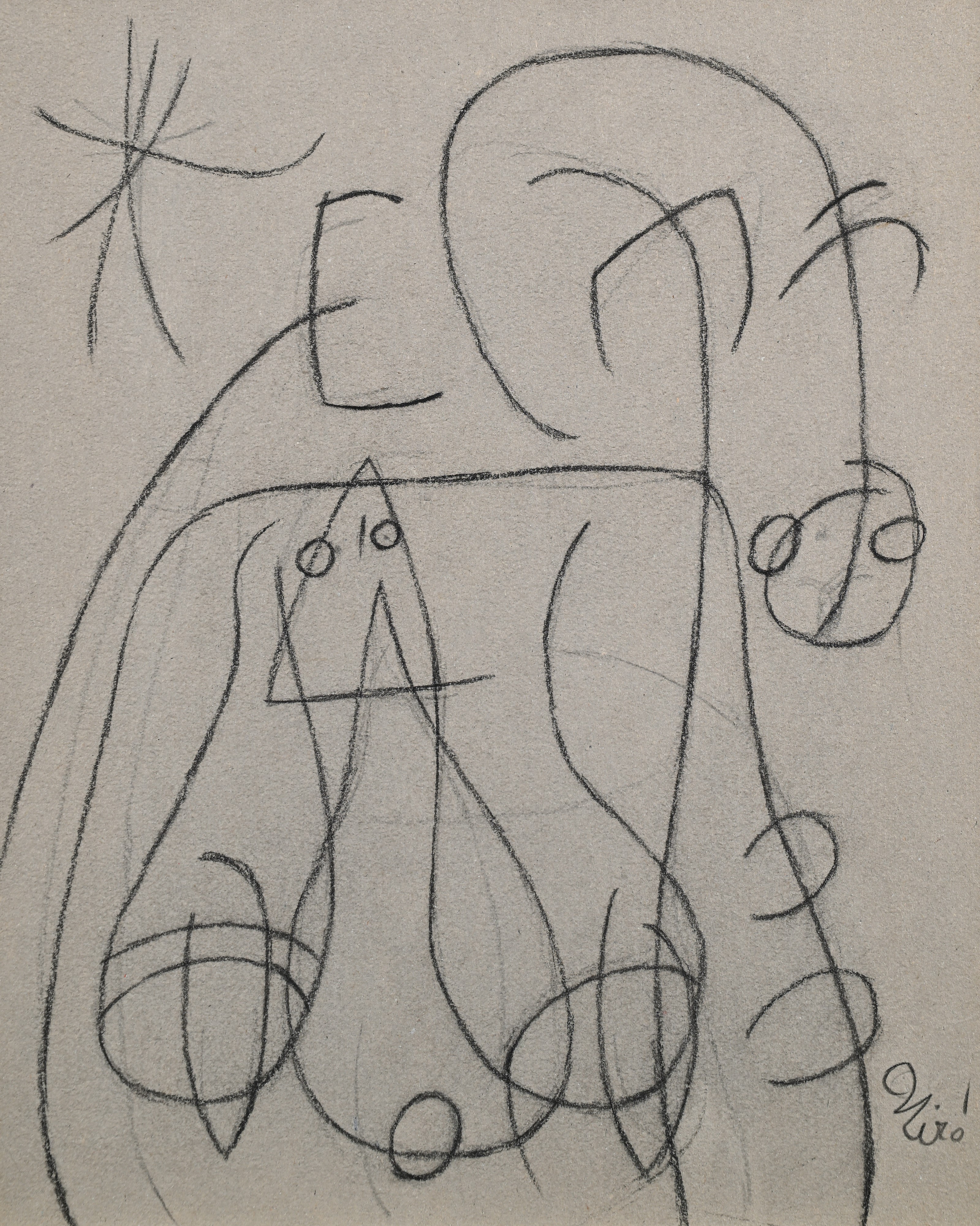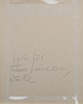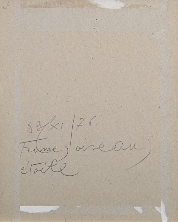 Firma in basso a destra "Mirò". Al verso reca titolo e data "Femme, oiseau, etoile, 23/XI/76"