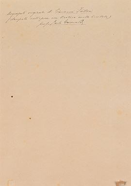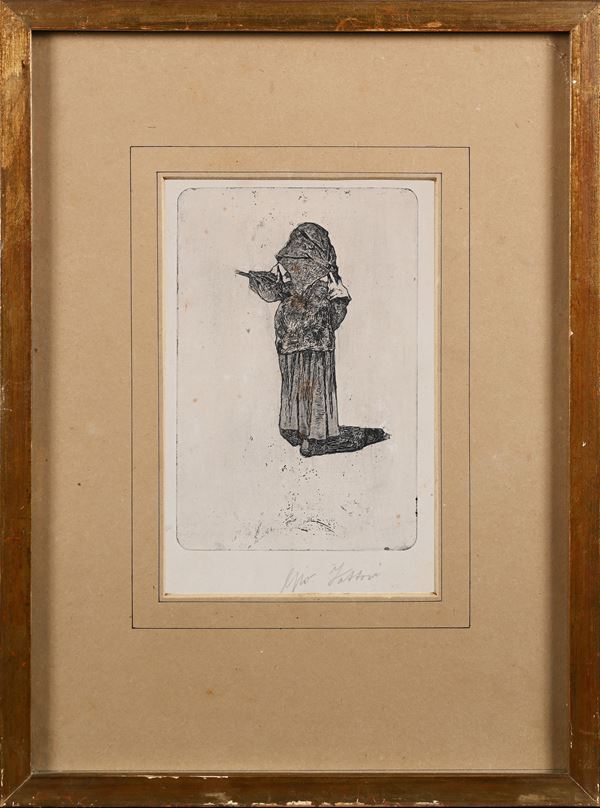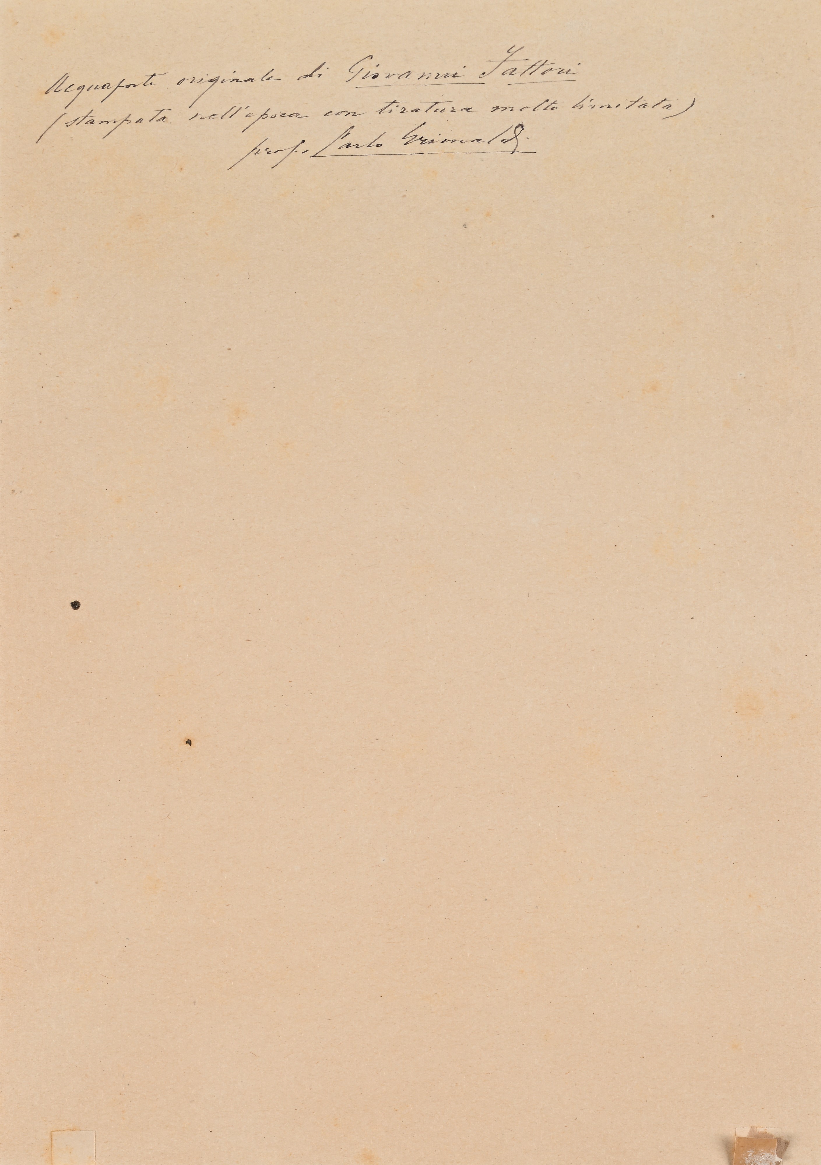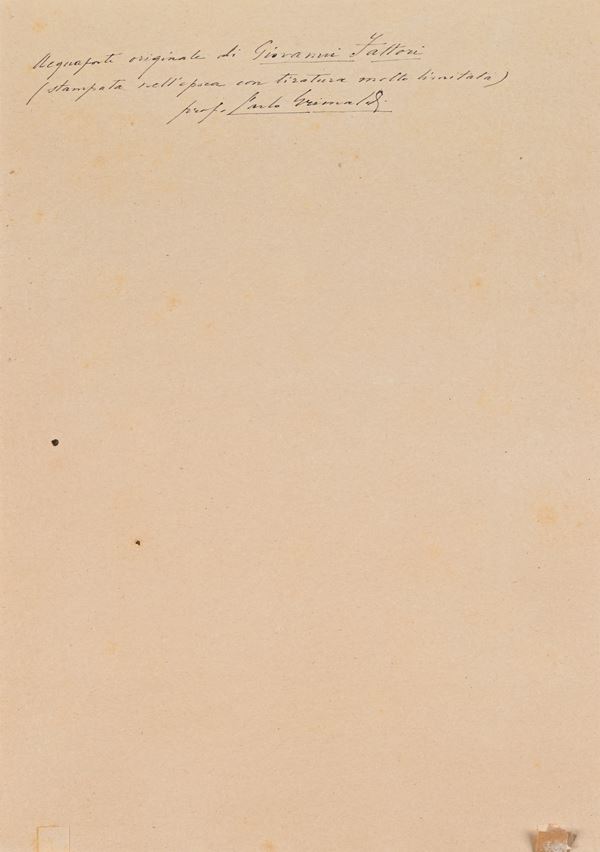 Sul retro dichiarazione di autenticità a firma di Carlo Grimaldi: acquaforte originale di Giovanni Fattori / (stampata nell'epoca con tiratura molto limitata) / prof. Carlo Grimaldi