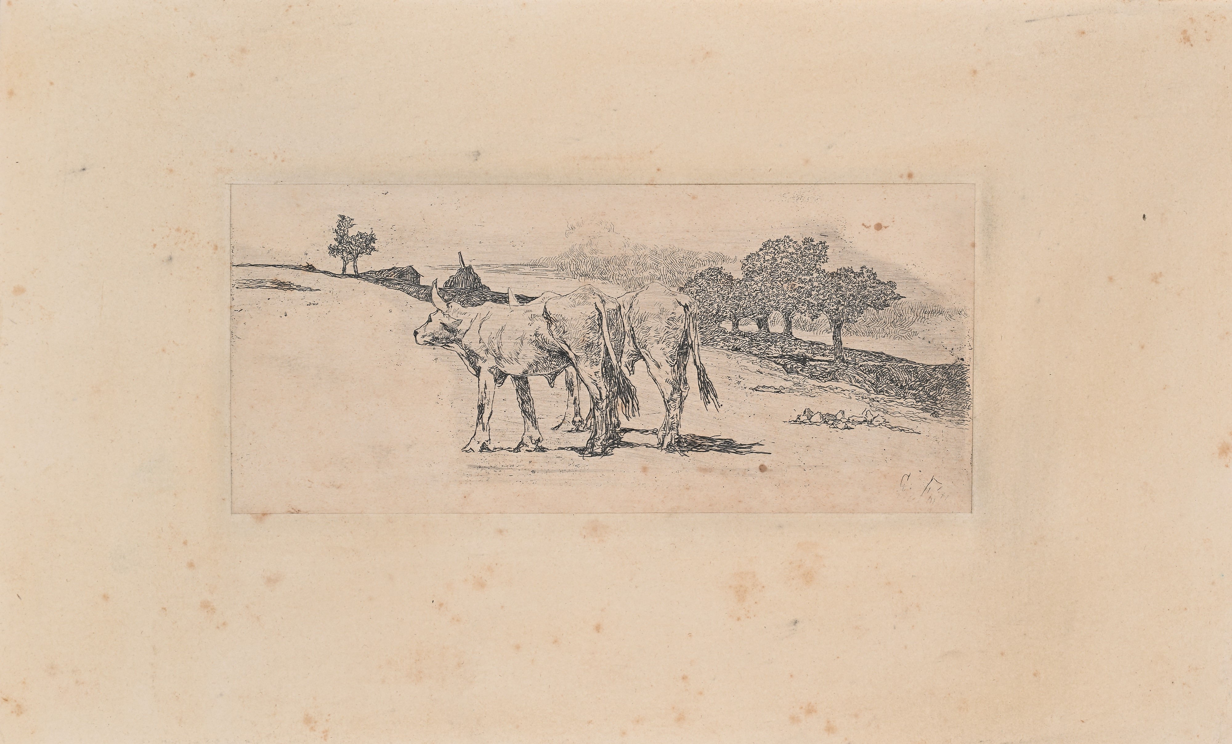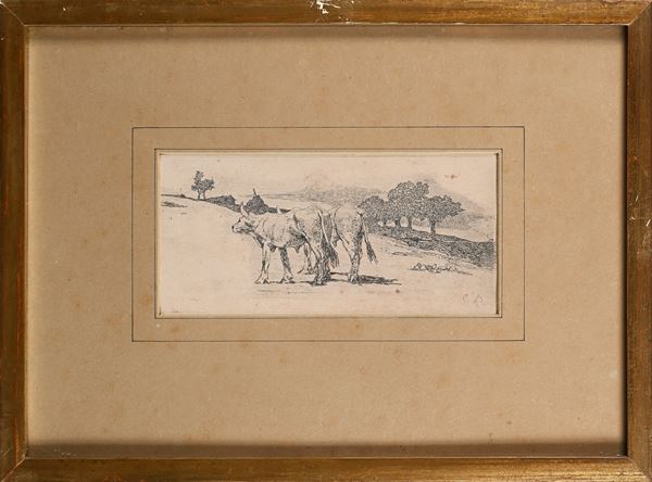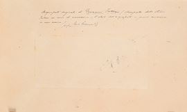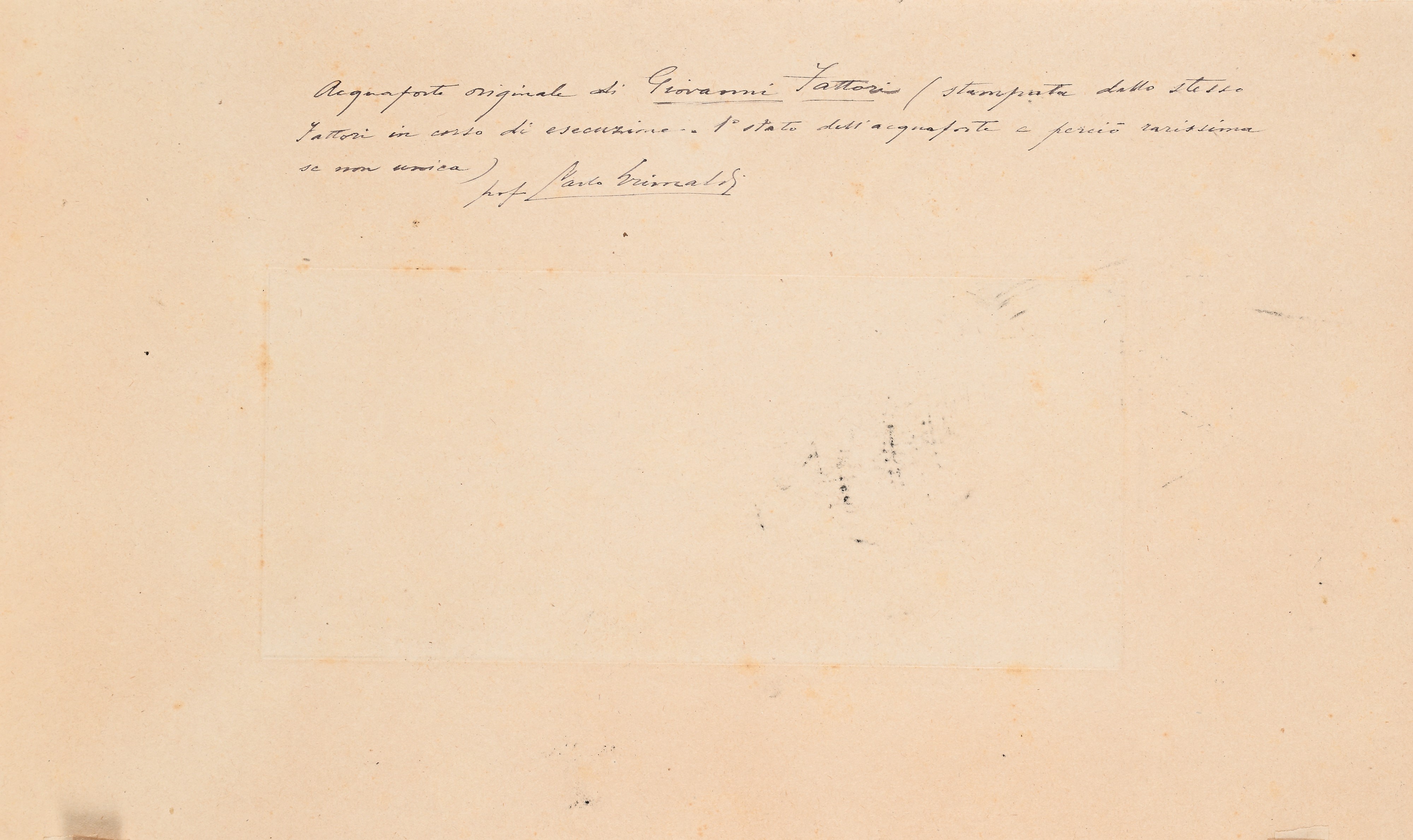 Sul retro dichiarazione di autenticità a firma di Carlo Grimaldi: Acquaforte originale di Giovanni Fattori / (stampata dallo stesso Fattori in corso di esecuzione. 1° stato dell' acquaforte e perciò rarissima se non unica) / prof. Carlo Grimaldi.