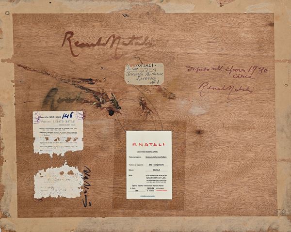 Sul retro: scritta e firma di mano dell’artista Dipinto nell'epoca 1930 / circa / Renato Natali; vecchia etichetta manoscritta con titolo e numero di riferimento (N 1); etichetta e timbro Raccolta Ugo Ughi con numero di riferimento (146); etichetta Archivio Renato Natali, con numero di riferimento (299) e codice (SXJDMXTTGAZIL) in data 18/09/24.
