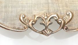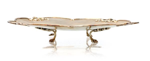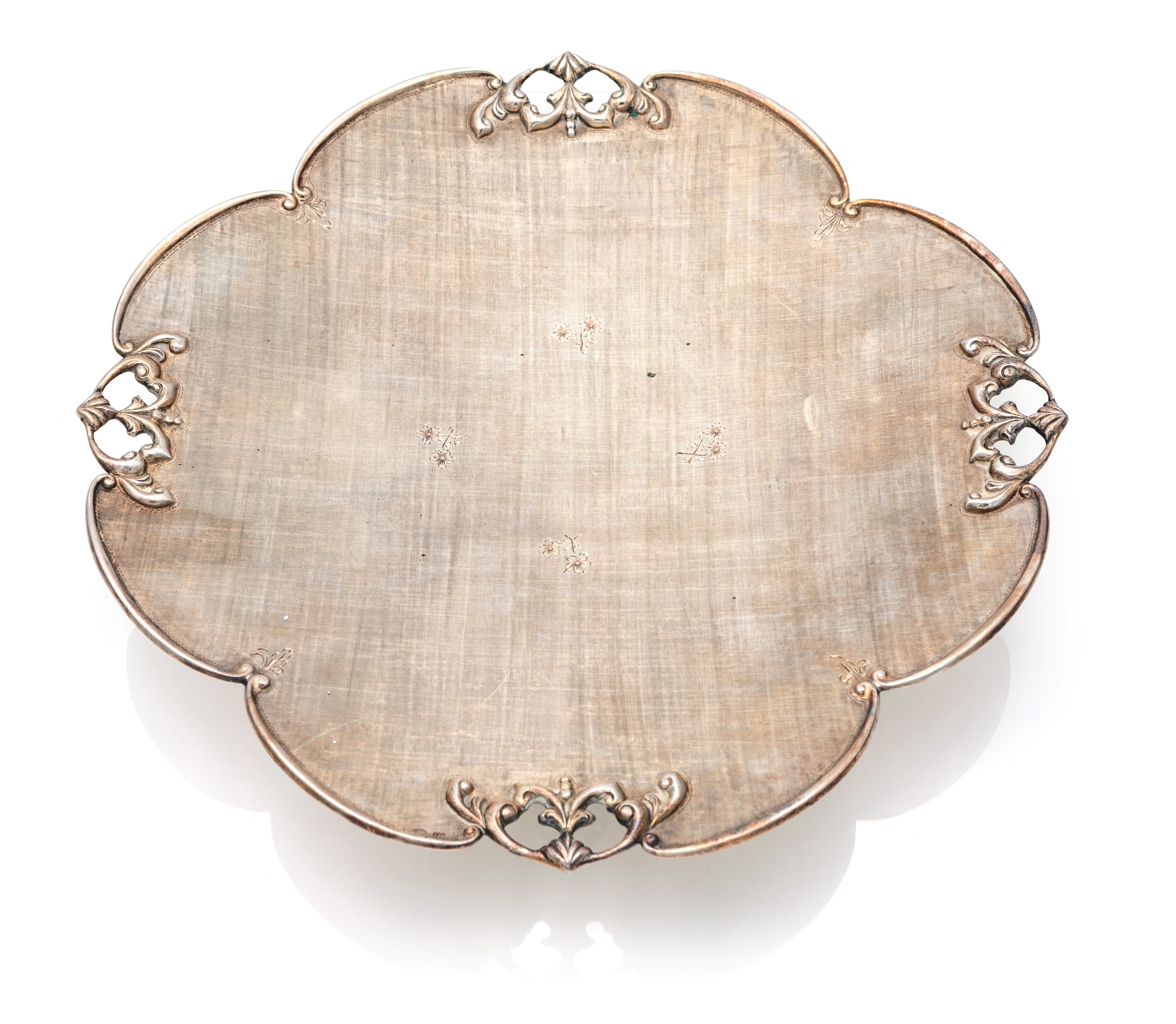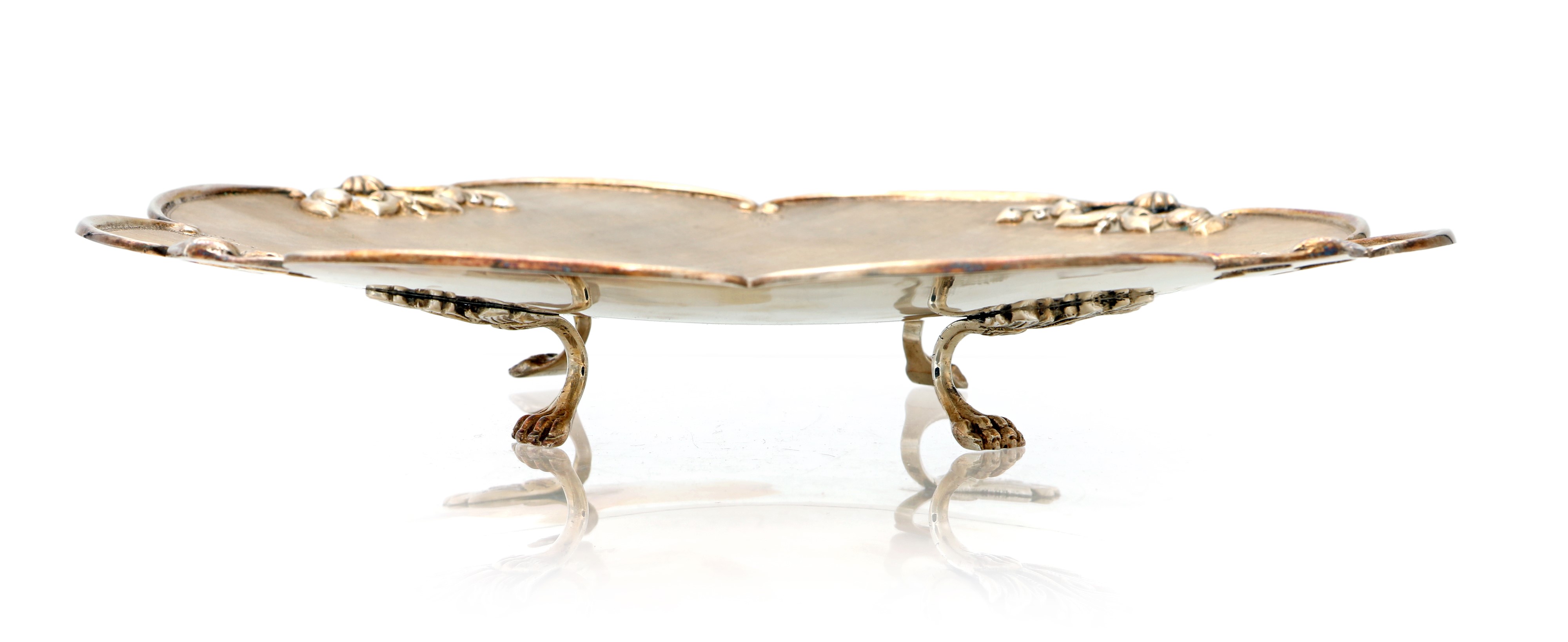 piatto di forma quadrilobata con orlo centinato intervallato da trafori vegetali; piedi incurvati con attacco a palmetta e desinenza ferina