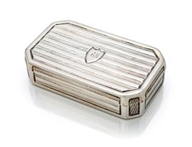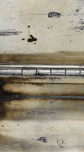 caratterizzata da angoli smussati e da uno scudo al centro del coperchio con iniziali incise; superficie interamente decorata a fasce lineari lisce alternate a sottili bande rigate