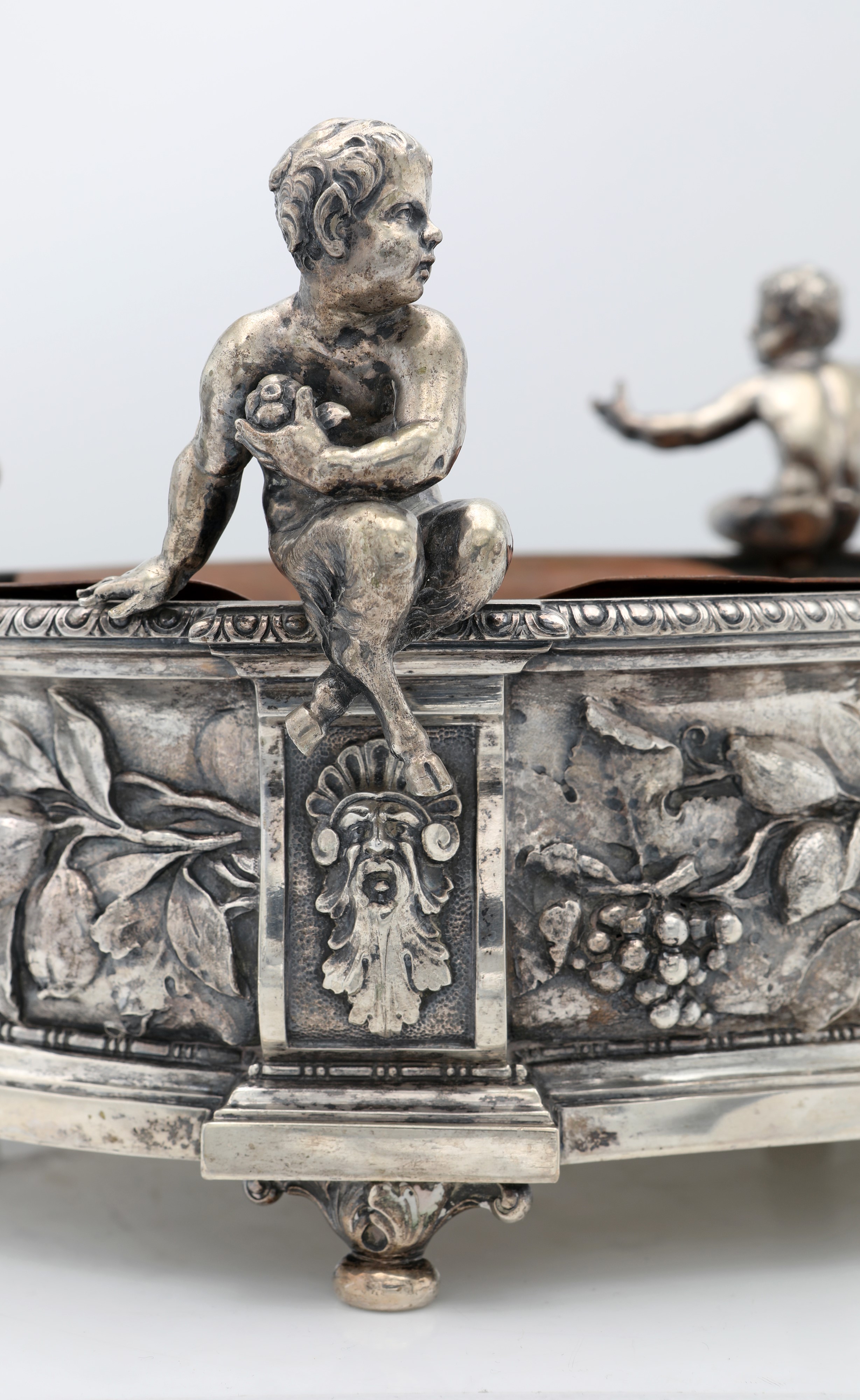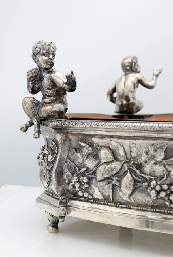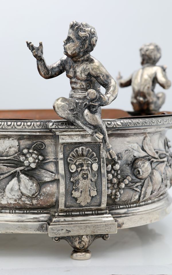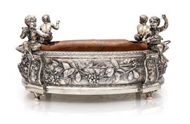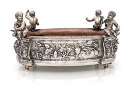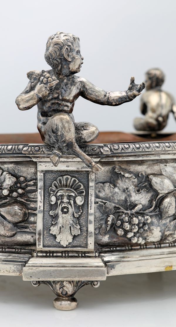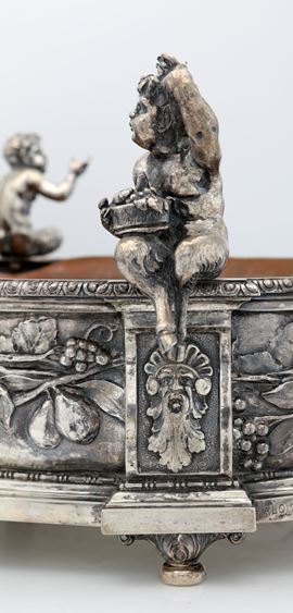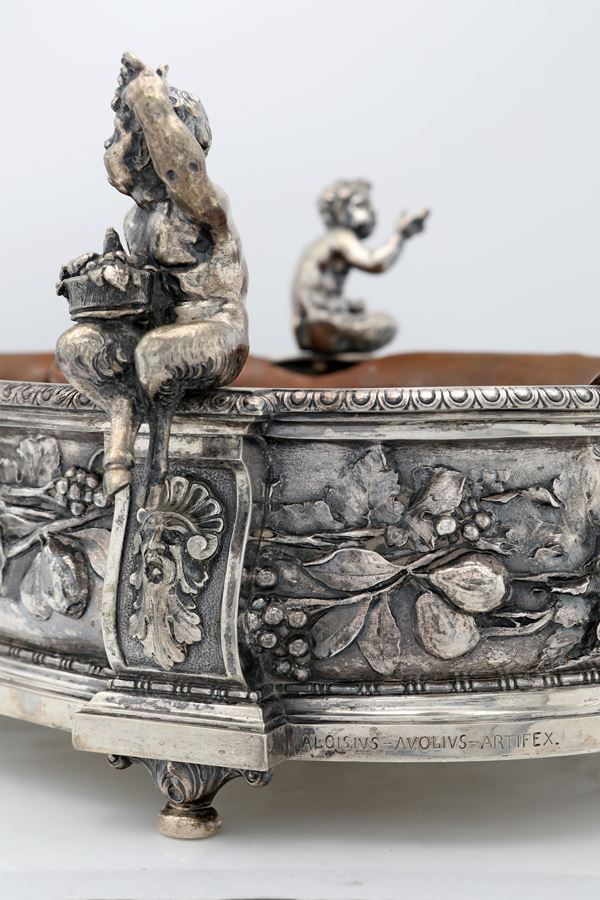 Questo centrotavola rivela tutta la maestria dello scultore nel fondere decorazione e narrazione mitologica. Le figure, modellate con finezza e movimento, animano la sommità della fioriera trasformandola da elemento d’arredo a piccola scena teatrale. L’argento cesellato cattura la luce, esaltando i dettagli anatomici e le espressioni vivaci dei fauni, mentre la forma ovale conferisce equilibrio e armonia all’insieme. Ne risulta un’opera elegante e al tempo stesso fantasiosa, emblematica della capacità di Avolio di combinare tradizione classica e gusto moderno.