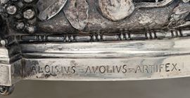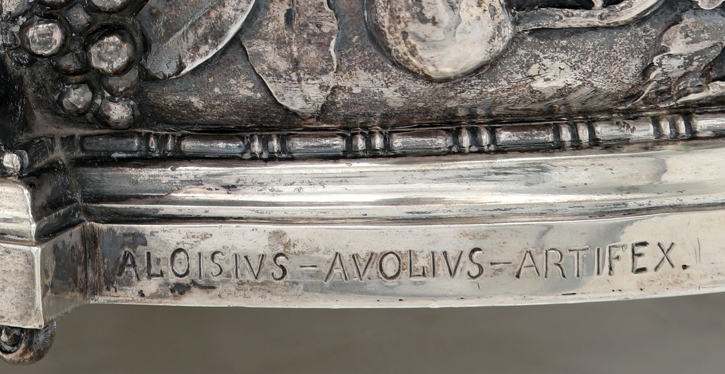 di forma ovale decorata in bassorilievo da tralci con frutti multiformi interrotti da quattro pilastri squadrati con figure di mascherone su cui siedono figure scultoree di giovani fauni, ognuno ritratto in diversa postura con frutti in mano. All'interno vasca estraibile in rame con prese mobili ad anello. Reca firma incisa lungo il profilo inferiore ALOISIVS - AVOLIVS - ARTIFEX. ("Aloisivs" è la variante latina del nome Luigi).
