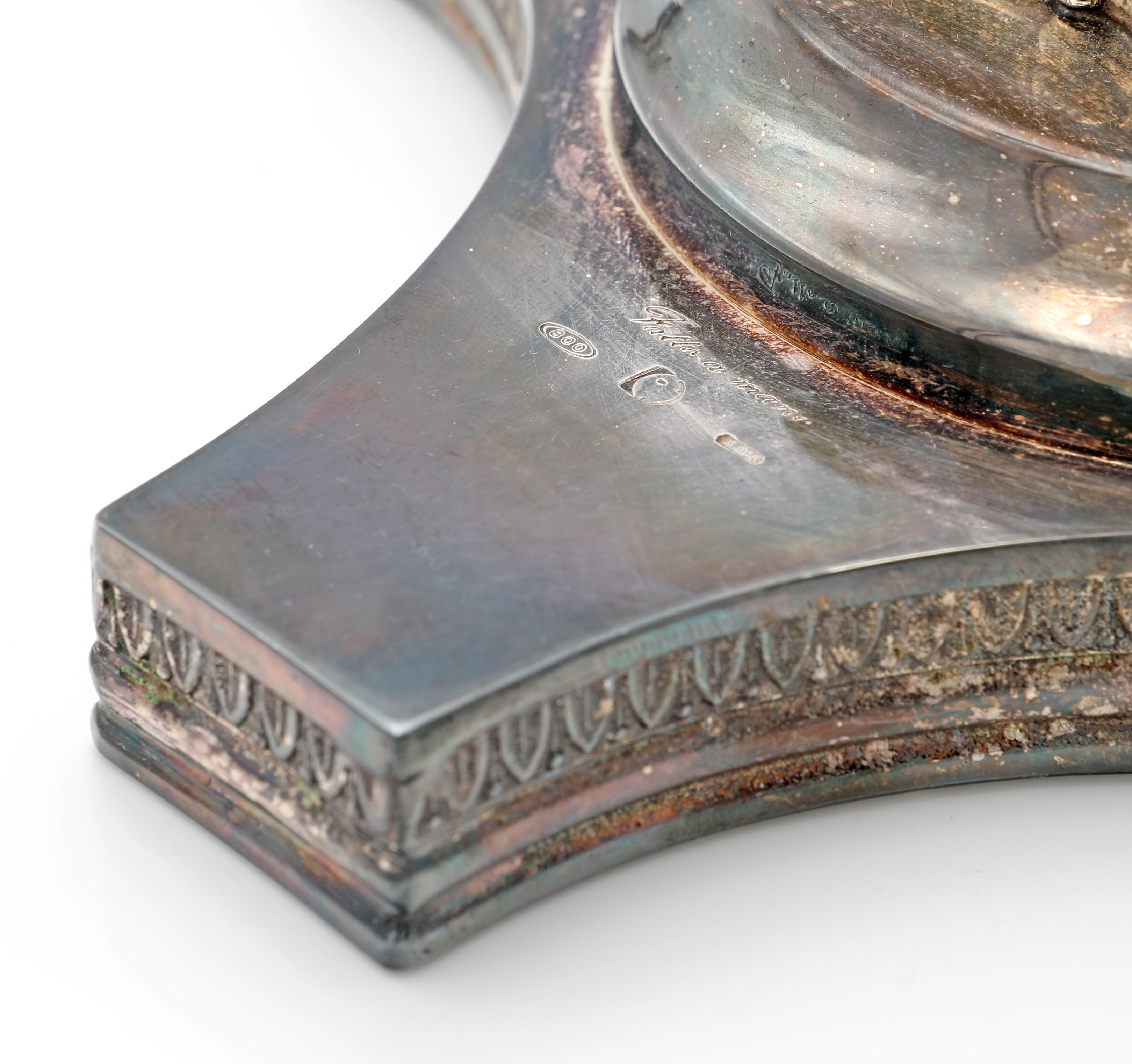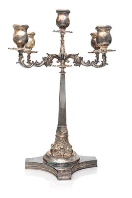 bracci sagomati con portacandele in forma di vaso, emergenti sulla sommità di uno stelo in forma di obelisco su capitello capovolto; piede quadrangolare