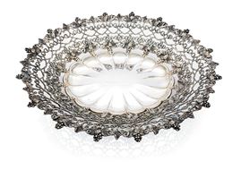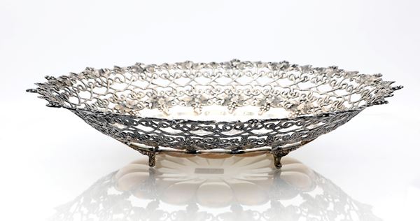 piatto a forma di corolla circondato da un ampio bordo traforato caratterizzato da due ordini di grappoli e foglie di vite; piedi arcuati