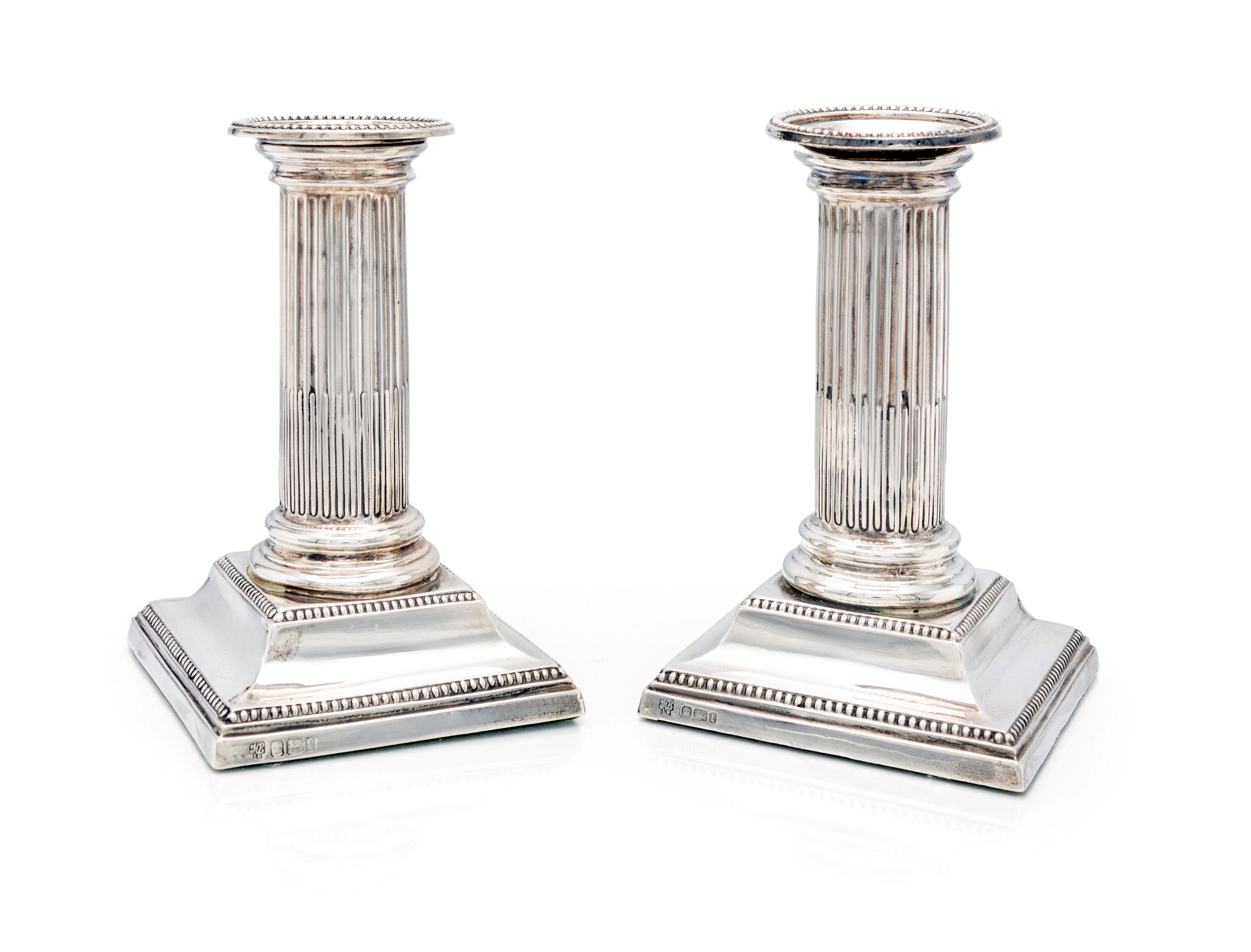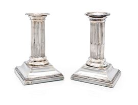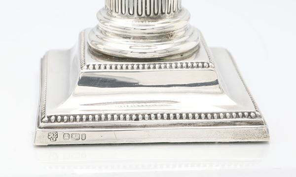 Coppia di candelieri a colonna in argento 925/000, città di Sheffield 1903, argentiere Hawksworth Eyre & co.