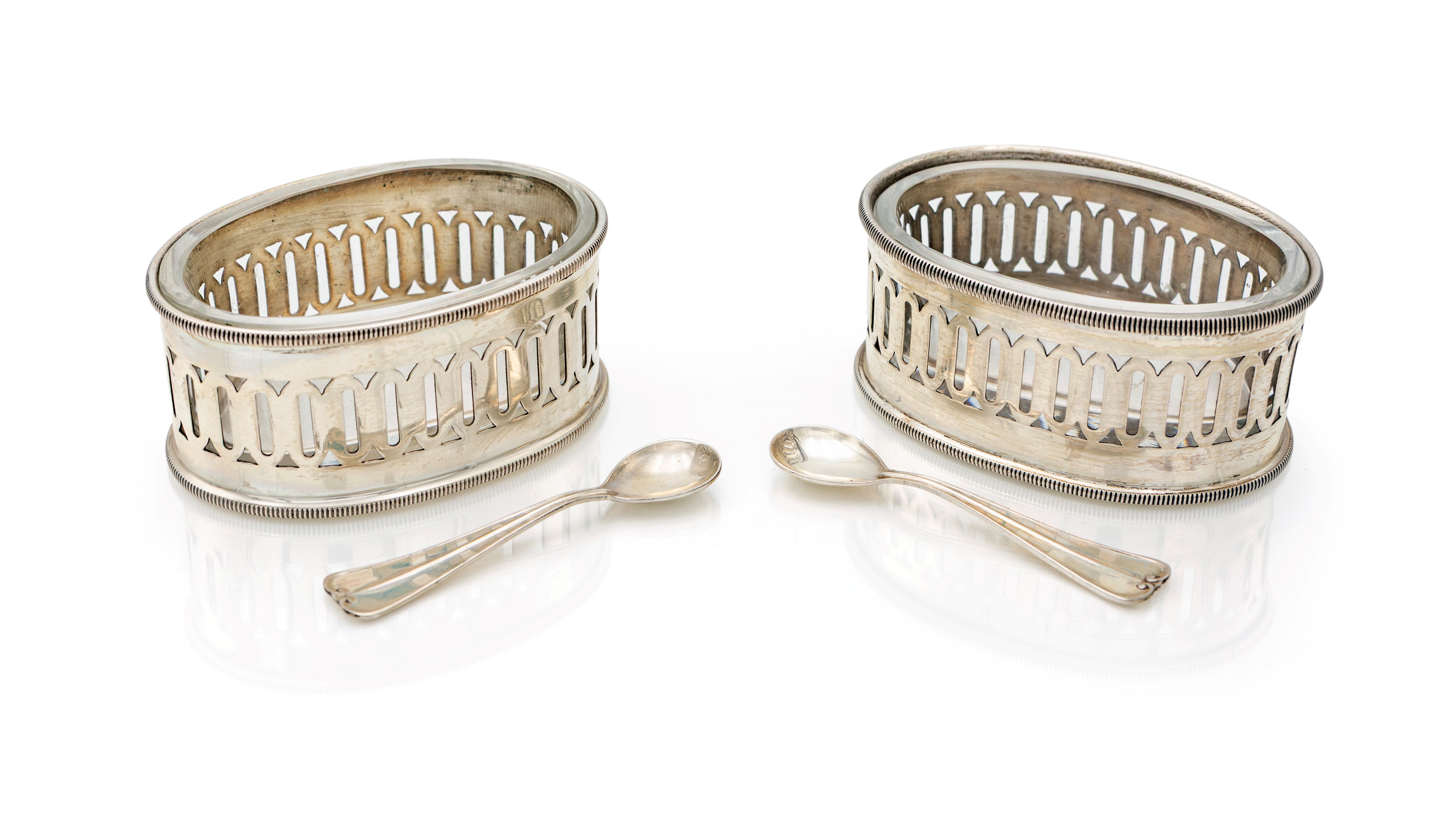 Coppia di saliere ovali in argento con cucchiaino e vaschetta in vetro