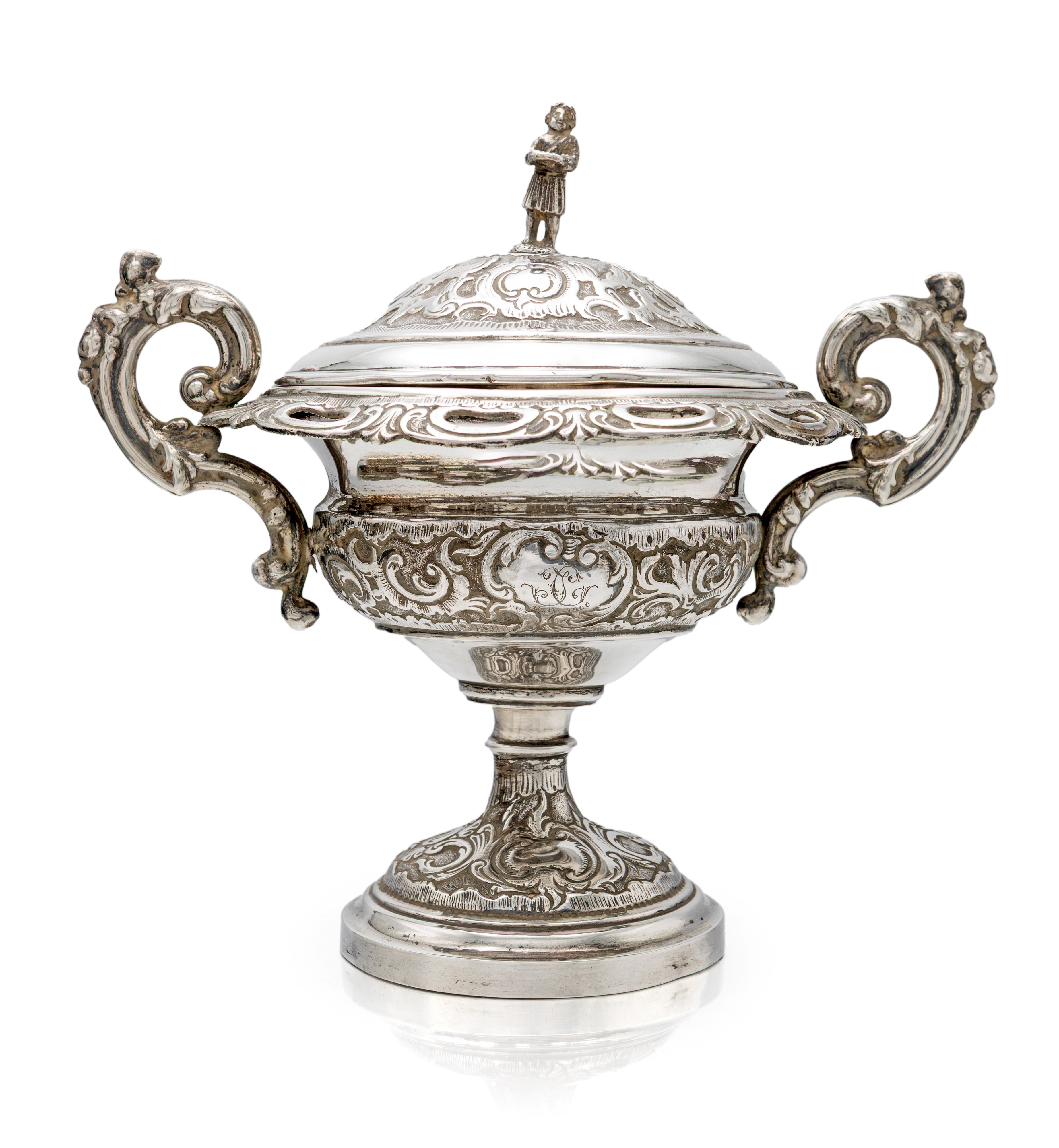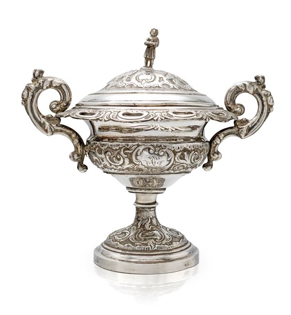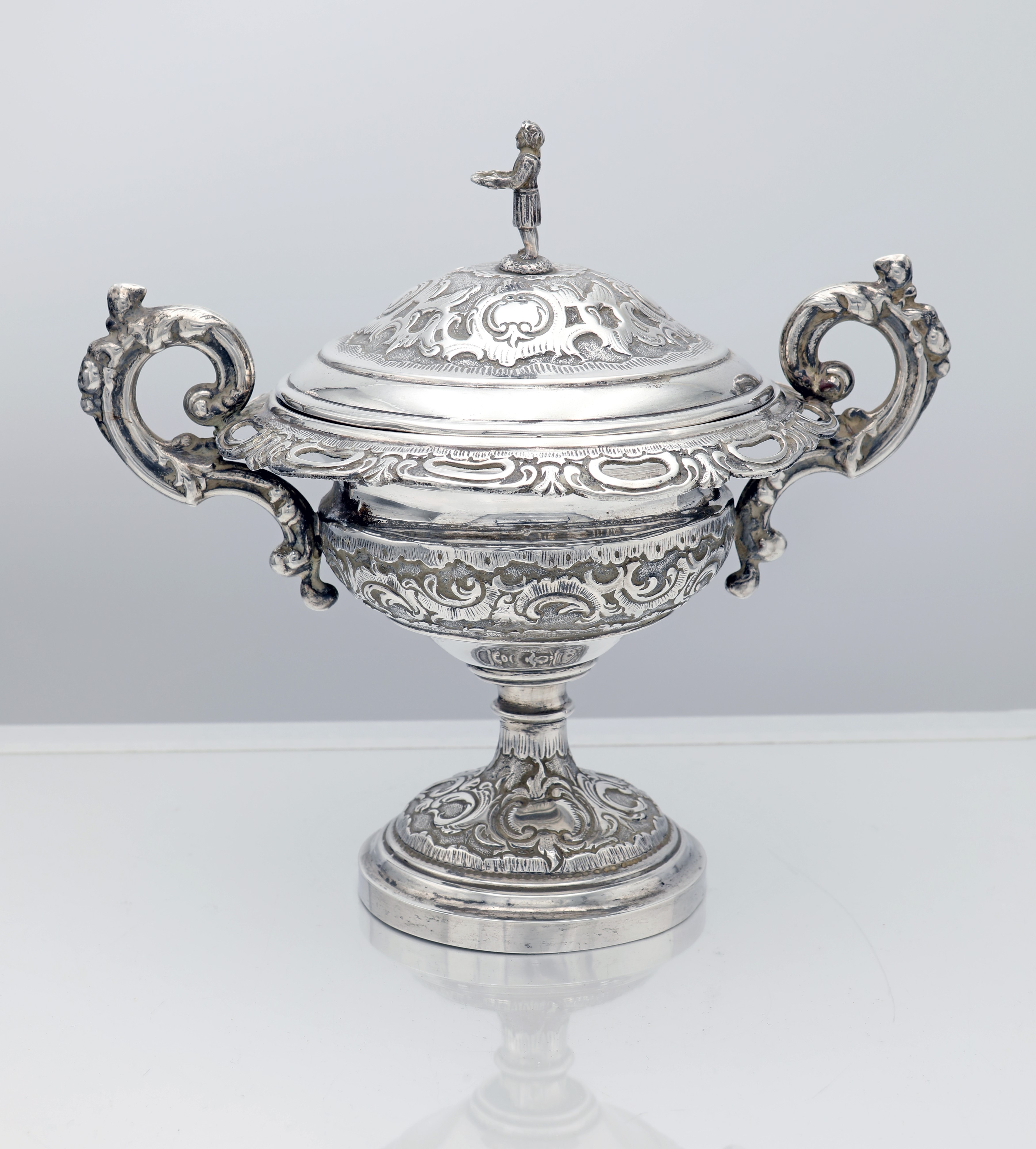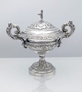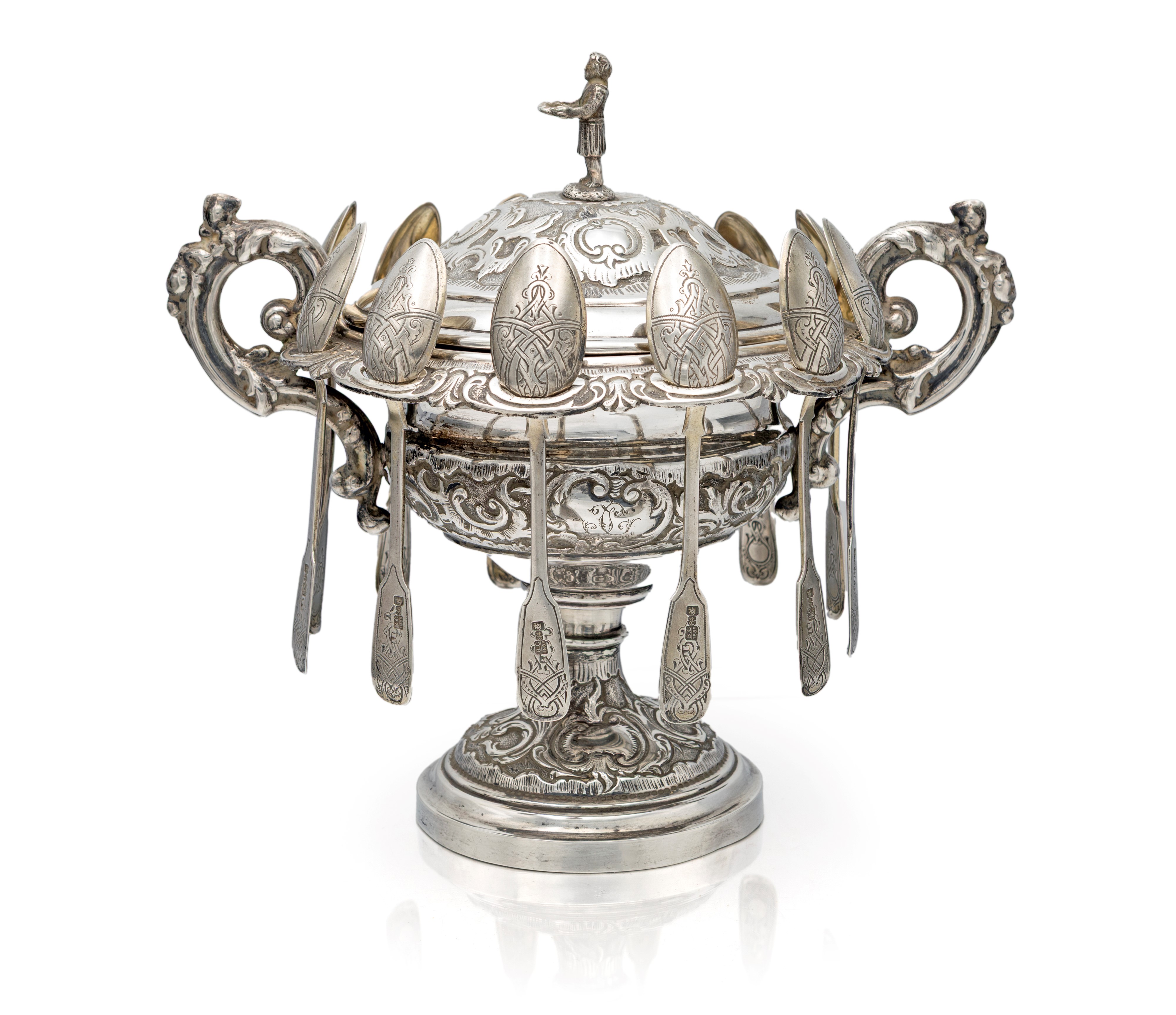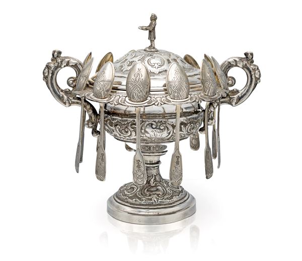 Dodici cucchiaini in argento 875/000, Russia, fine XIX secolo e zuccheriera biansata con coperchio