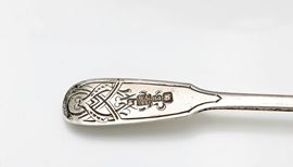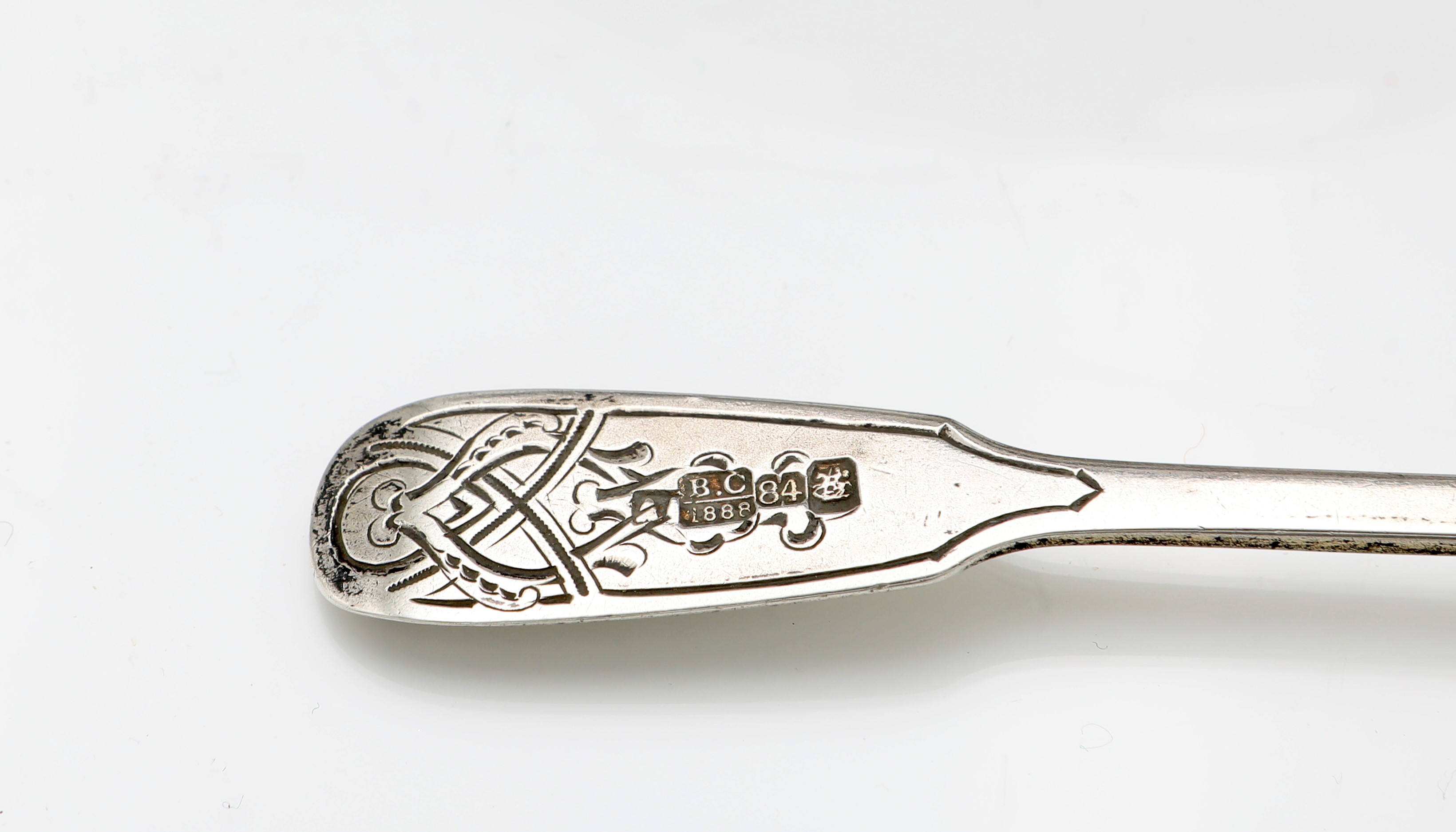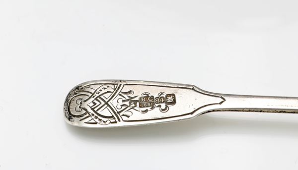 ogni cucchiaio è caratterizzato da paletta ovoidale incisa nella parte convessa ed impugnatura con vertice a scudo inciso sia al recto che al verso. Bolli di titolo e datario 1888