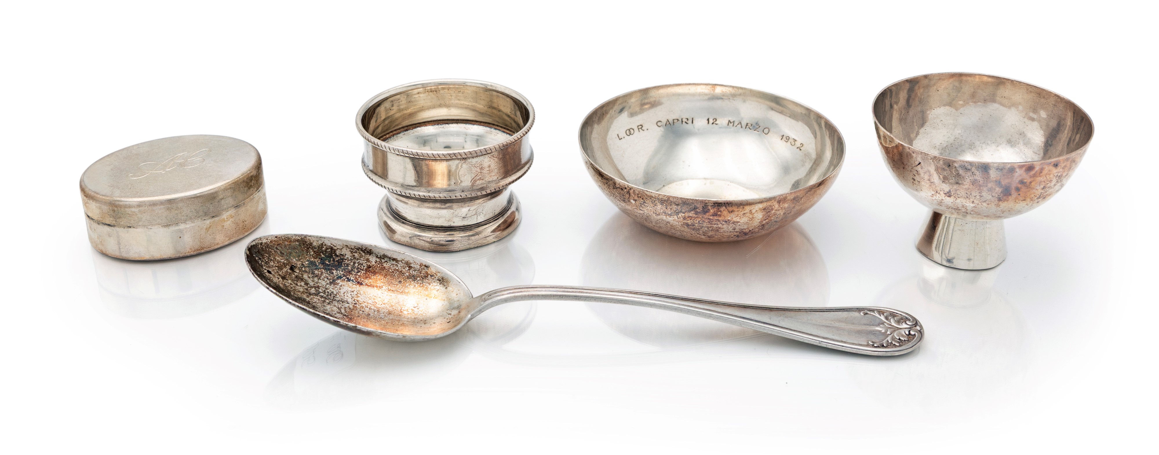 tre ciotoline diverse, un portapillole ovale con inciso AC ed un cucchiaio con impugnatura arrotondata caratterizzata da motivi vegetali