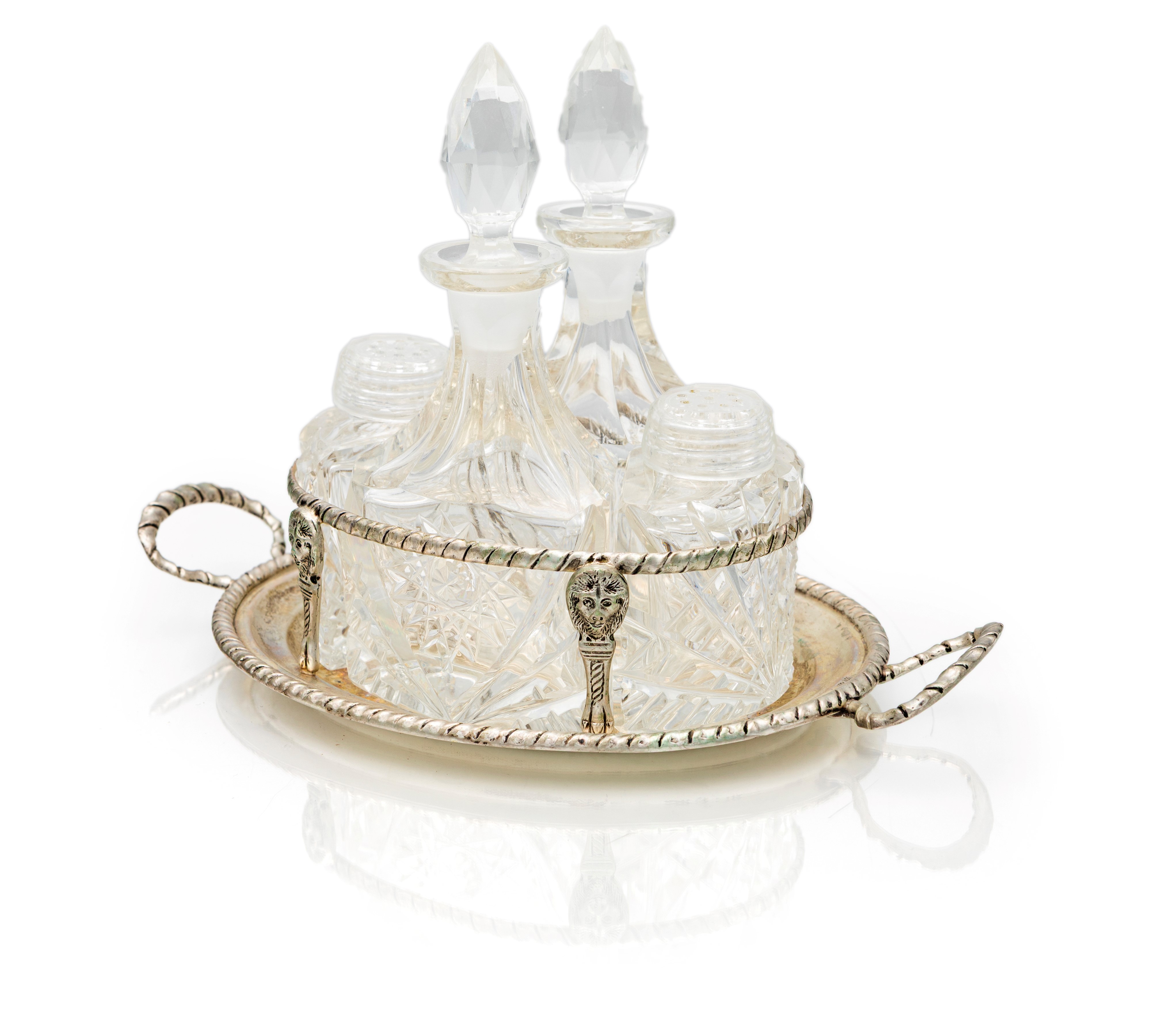 con flaconi per olio, aceto, sale e pepe di forma geometrica in vetro pesante, trattenuti in una struttura ovale con presa centrale